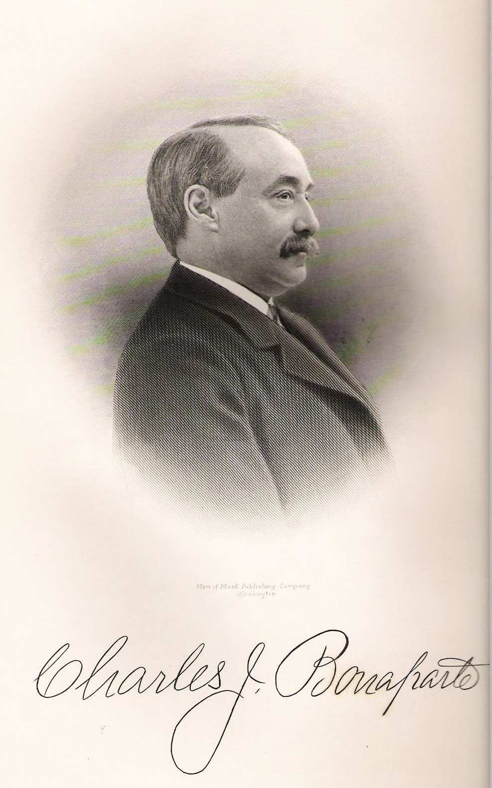 Charles Joseph BONAPARTE, the younger of the two sons of his parents, was graduated from Harvard college in 1871, and from the Harvard law school in 1874. Returning to Baltimore, he began at once the practive of law in his native city, where he has continued to reside. His chosen profession, and a deep and constant interest in civil service reform and in practical efforts to further good government and to secure needed political reforms in his own state and city and in the country-at-large, have occupied him for the more than thirty years since he began the practice of law.