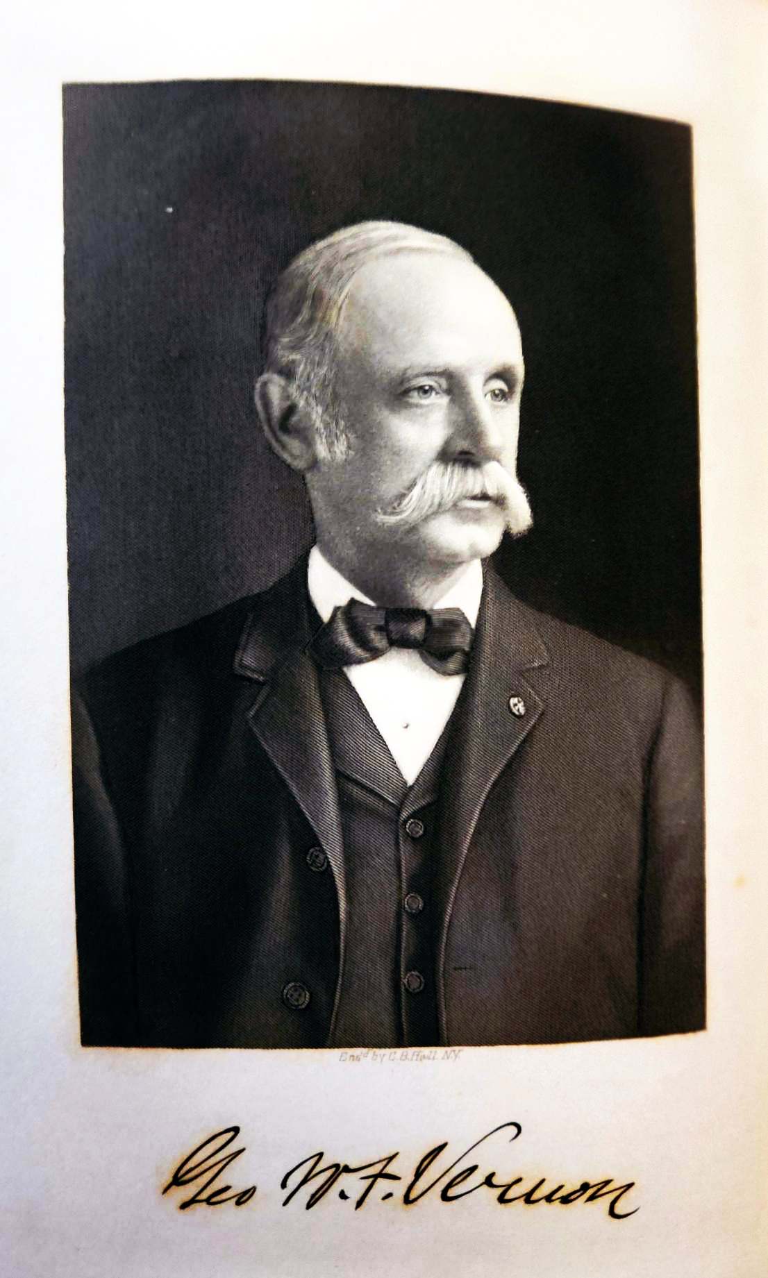 George Washington Fayette VERNON, real estate broker and attorney-at-law, born at Frederick City on June 14, 1843, was the son of Nathaniel and Charlotte A. Vernon. His father, a man methodic in his habits and temperate in all things, began life as a lawyer in Pennsylvania and later served for forty years as professor of mathematics in Frederick College. He was also a soldier in the War of 1812 and a school inspector in Frederick County. The emigrant ancestor was Thomas Vernon, who came to Philadelphia in 1682 and soon settled in Chester County, Pennsylvania. Thomas Vernon, grandfather of the subject of this sketch, was a soldier in the Revolutionary War.