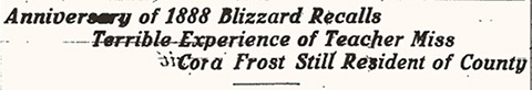 January 12 marked the forty-first anniversary of the memorable blizzard of 1888. It was indeed an anxious time for Miss Cora Frost, who was teaching school in district 51, near Plainview. The attendance that day was fifteen, two of the pupils being little girls. By noon the storm was so violent that the director, Ed Watson, and Mr. Davis came for their children in sleds and advised Miss Frost not to permit the rest of the students to start home until the storm was over. These two men experienced considerable difficulty in reaching home after leaving the schoolhouse. The larger boys carried in a supply of coal, and Miss Frost and her scholars remained throughout the night in the buildings. By keeping the stove red hot, they managed to be quite comfortable, although the temperature outside forty degrees below zero. As the tire-some hours wore one, they amused themselves by playing games, and each one bravely kept from complaining of hunger. The smaller children were covered with wraps, and got some rest. All were overjoyed when, at 5 o’clock the next morning, George Nelson arrived with a basket of provisions, and later assisted them to their homes, the storm having abated. Miss Cora Frost taught four years in districts 51 and 62 and in the public school at Brunswick. Altogether, she taught sixty-six terms of school in Antelope county, the terms ranging from two to nine months. The concluding term was finished in 1915. Her largest attendance was in district 62, where she had an average of thirty-five scholars. For a number of years she received only $20 as monthly wage, paying $8 for her board. Before coming to Nebraska, she taught two terms in Belle Plaine, Iowa, and one term in Kansas during the early days. A sister, Miss Jennie Frost, commenced teaching in this county in 1883, and completed fifteen terms. In all, five of the Frost sisters were teachers during pioneer days and they certainly had a big share of the educational progress of Antelope County. Miss Cora believes she has instructed a thousand in all. It is said that there are very few of the older residents of their community who have not gone to school to one of “The Frost Sisters.” Their mother, now deceased, taught the “three R’s” in Iowa when the state was new. The girls received their education at Belle Plaine, Iowa, which is located in Benton County, Iowa. These highly respected citizens still live on the Frost homestead near Brunswick, and their many friends hope the remaining years of their life may be as care free and happy as they deserve. |