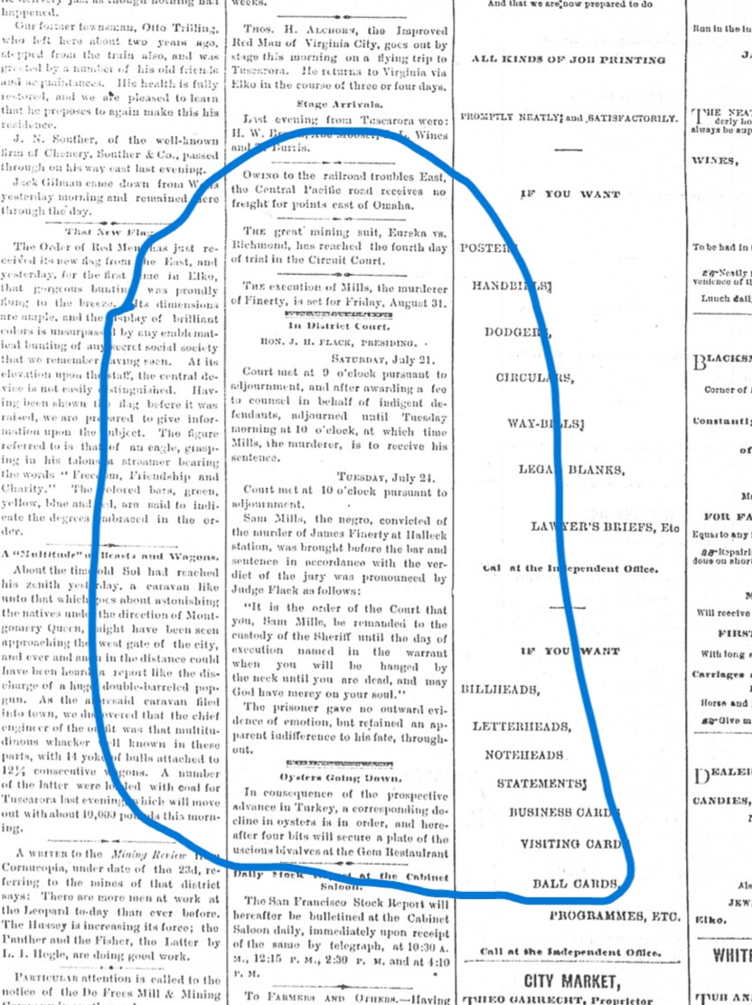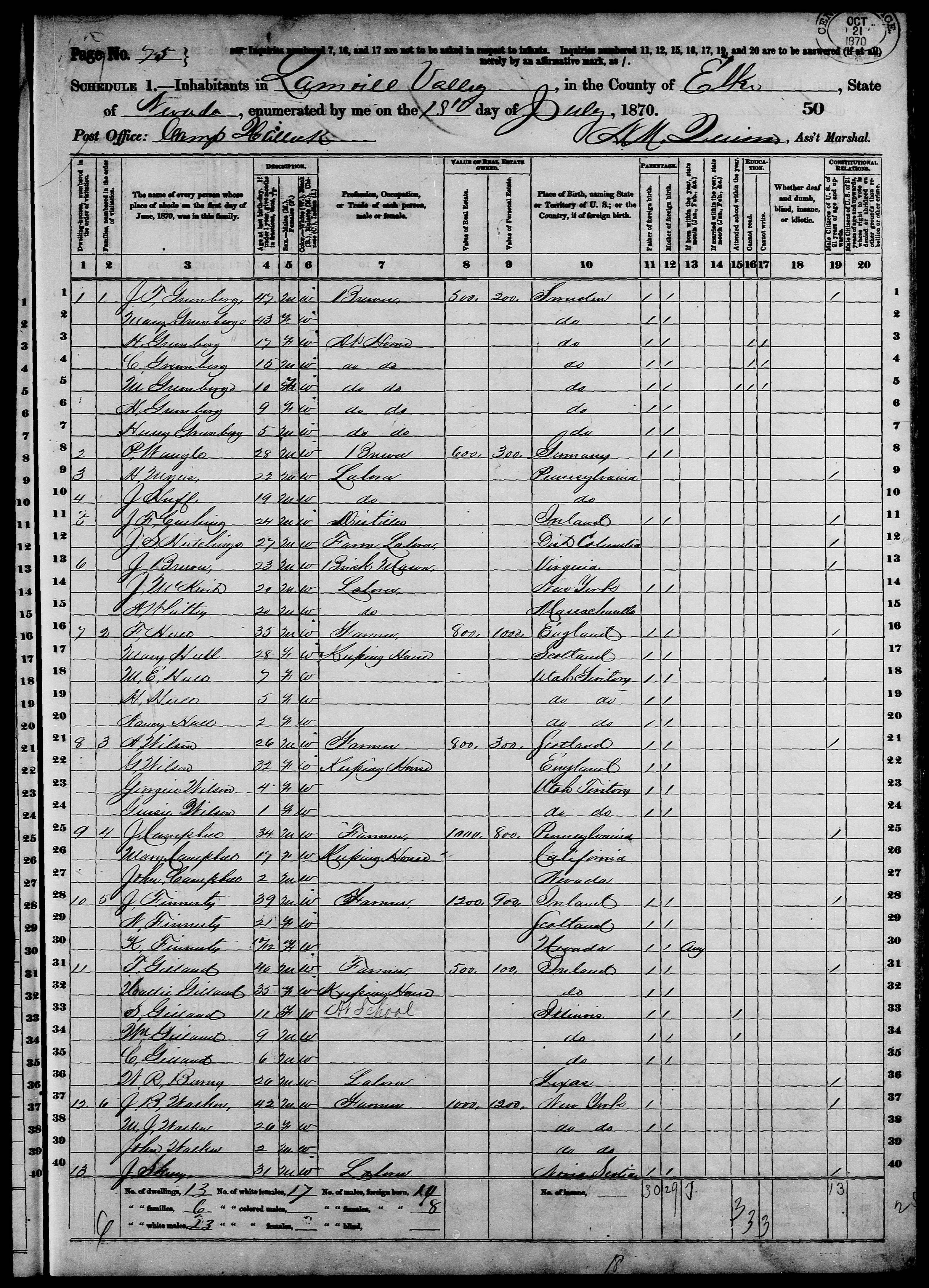 James FINNERTY born 05 Dec 1829 in Ireland; served during Civil War "James Finnerty was commissioned and mustered in as 2nd lieutenant of Captain John B. Urmy's Company G, 3rd California Infantry, at Benicia Barracks, California, June 8, 1862. He was promoted to 1st lieutenant and transferred to Captain Josiah Hosmer's Company E, 3rd California Infantry, July 2, 1864. During his service in Utah Territory, he protected the overland mail route. First Lieutenant Finnerty was discharged at Camp Douglas, Utah Territory, due to the consolidation of his regiment into a battalion of infantry."; married Nettie Janet McGAVIN born ca 1851 in Scotland; died 24 Dec 1914; she first married James FINNERTY, second married William Gardner RANDOLPH born 1852 - died 1936. James and Nettie FINNERTY resided in Halleck, Elko County NV. James served as Justice for Town of Lamoille 19 Nov 1870; died 25 Jan 1875, in Lamoille from gunshot.