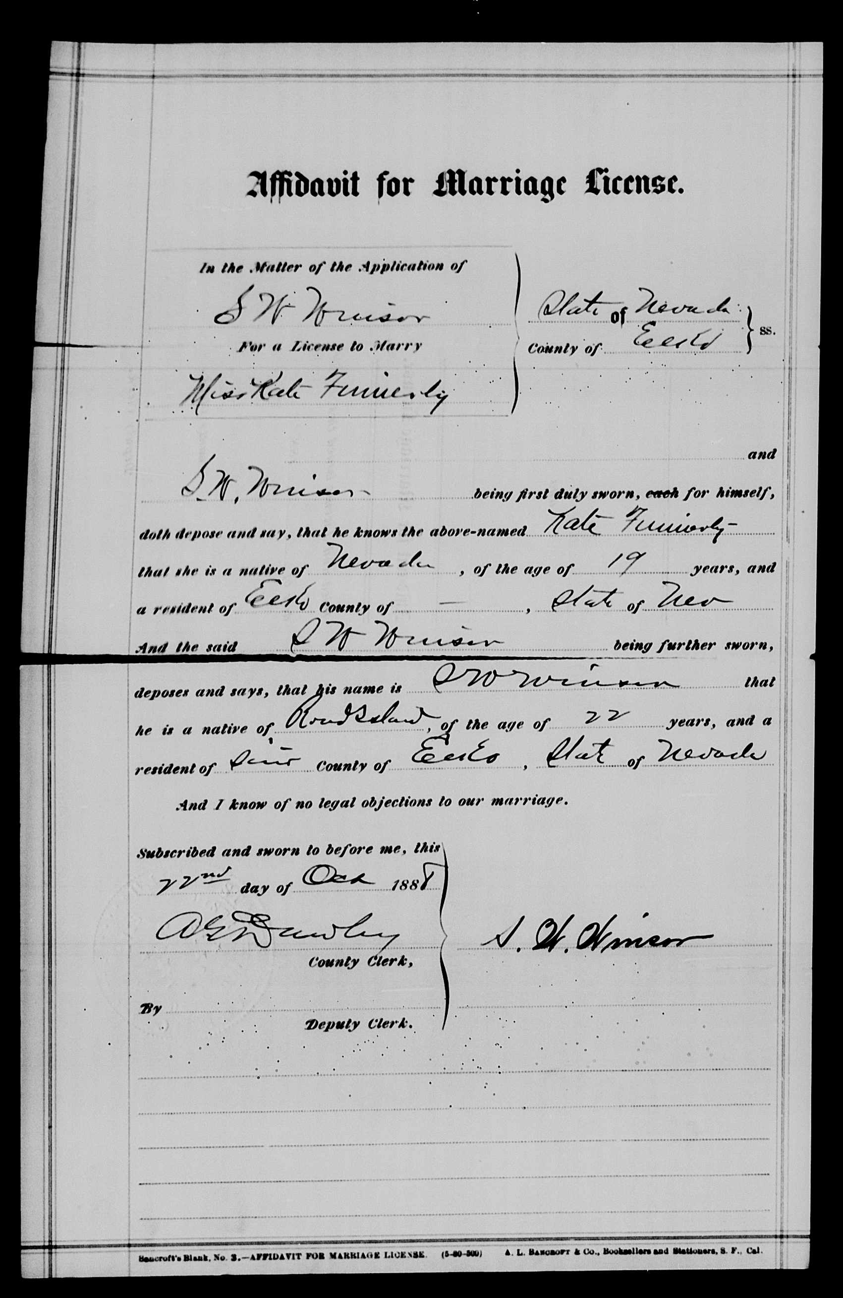 1. Catherine FINNERTY, daughter, born 21 Aug 1869 in Halleck, Elko County NV; married 22 Oct 1888 in Elko County NV to S. Willis WINSOR