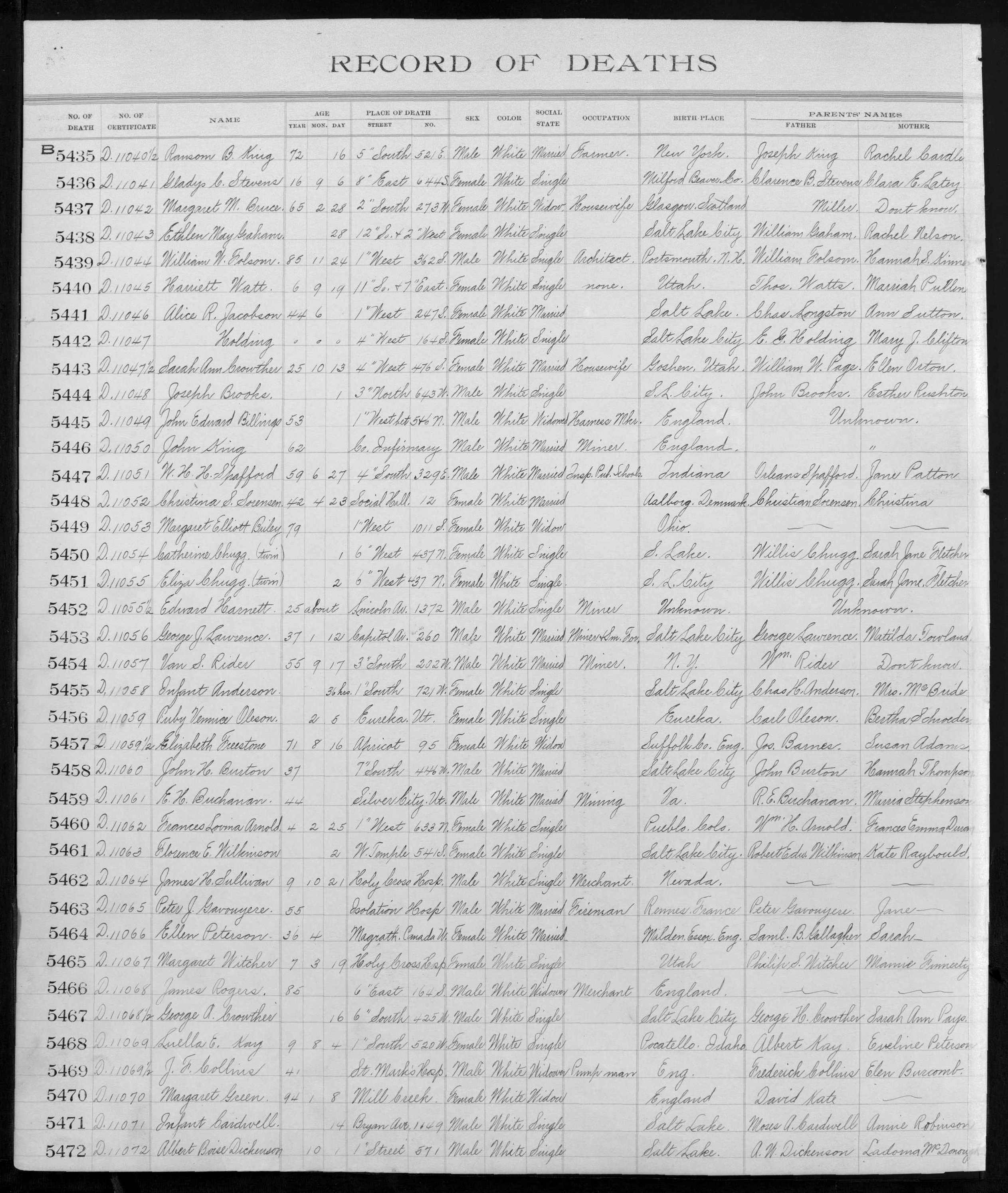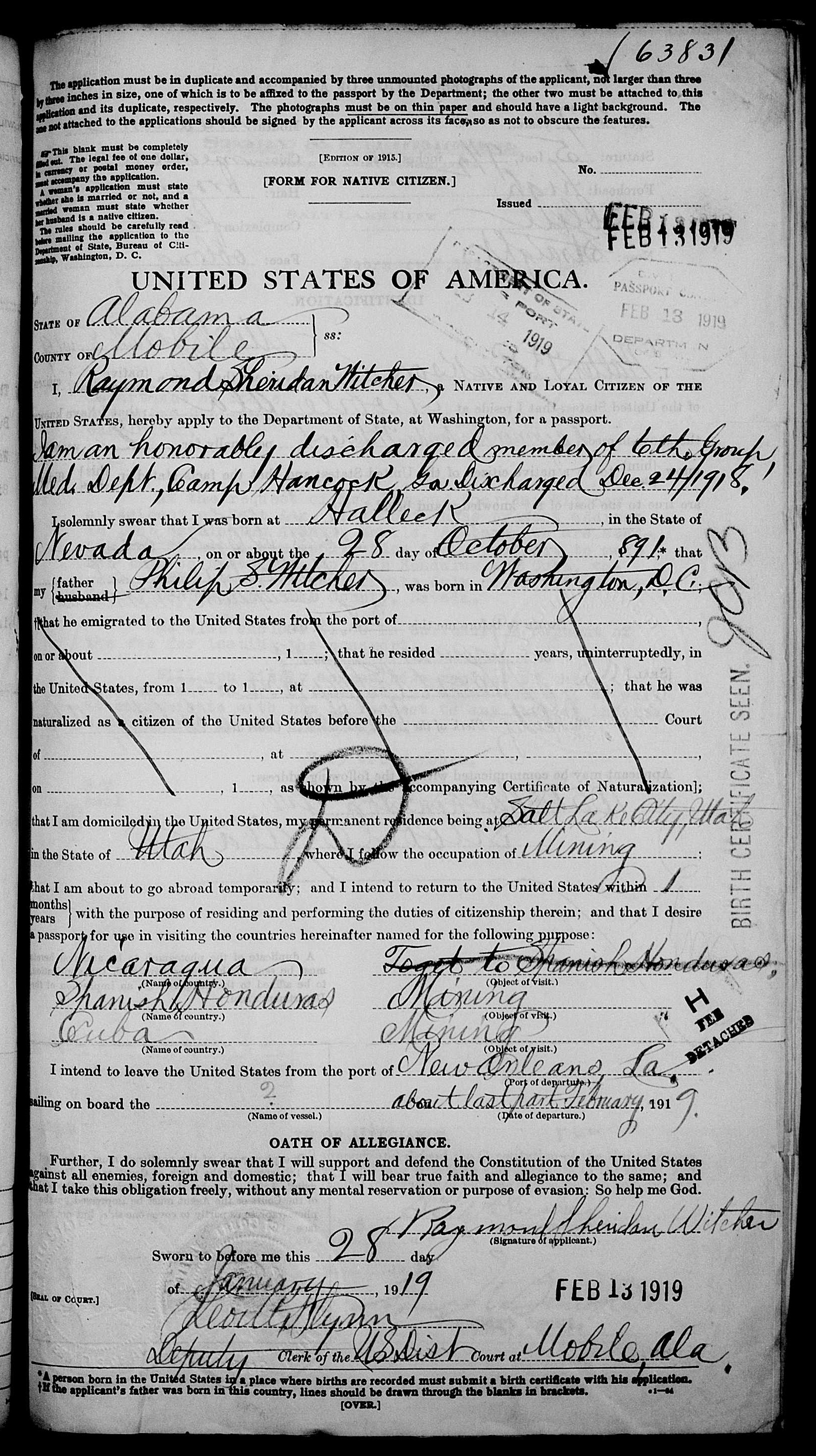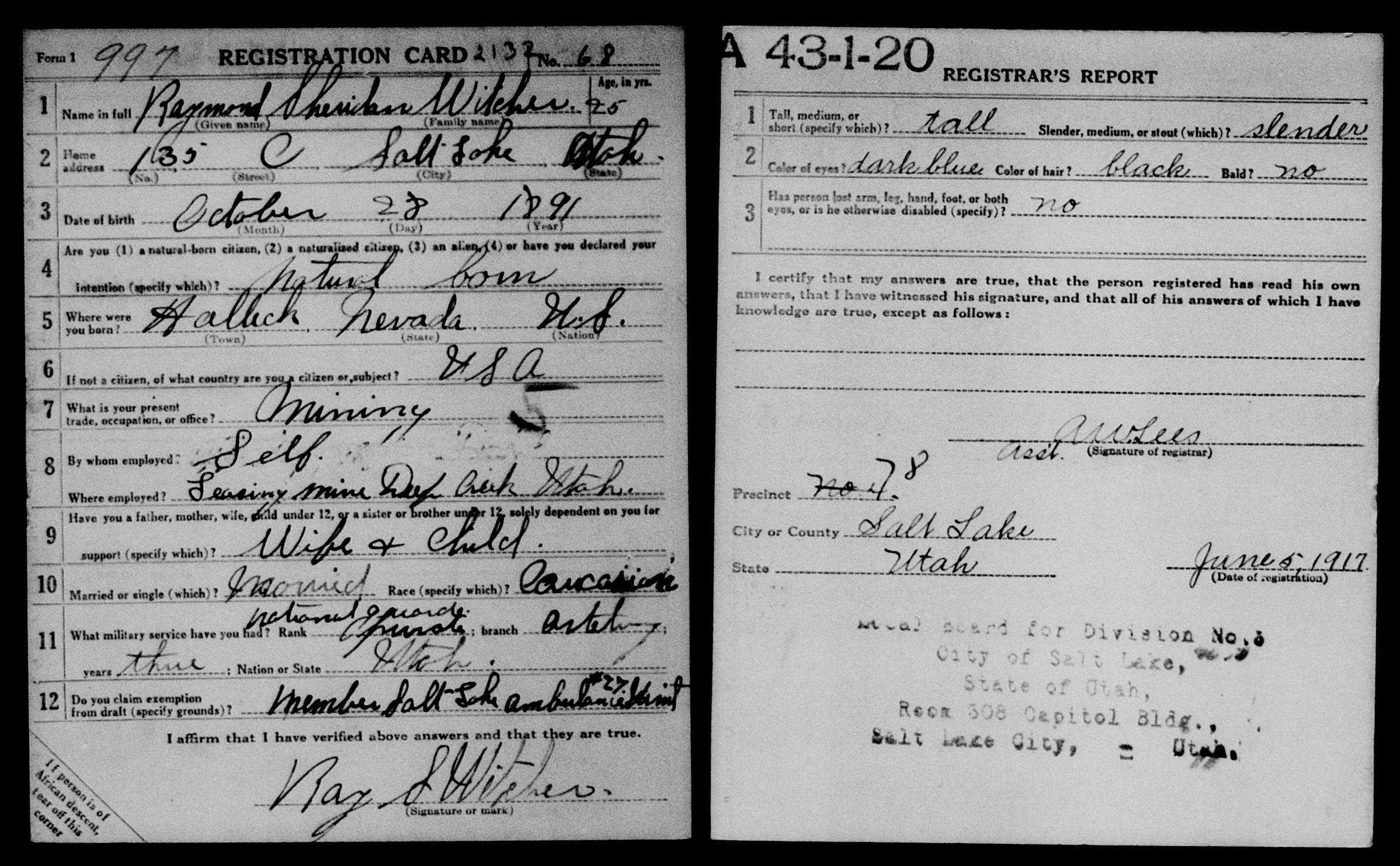 2-1. Raymond Sheridan WITCHER, son, born 26 Oct 1891 in Halleck, Elko County NV; married 08 Jun 1913 in Ely, White Pine County NV to Violet Virginia CLARK; married 2nd to Anna Gertrude GAULT; married 3rd to Lila Catherine HARPER; died 26 Aug 1950 in San Diego County CA.Raymond and Violet had at least one child:2-2. Margaret WITCHER, daughter, born 12 Dec 1893 in Utah; died 31 Mar 1901 in Salt Lake City Utah [father Philip, mother Mamie].