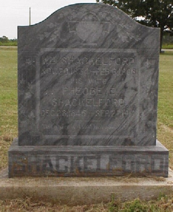 ![]() ![]() Wm. Shackelford 20 November 1834 - 6 February 1908 Pheobe E. Shackelford 28 December 1845 - 27 September 1917 Dallas Morning News
