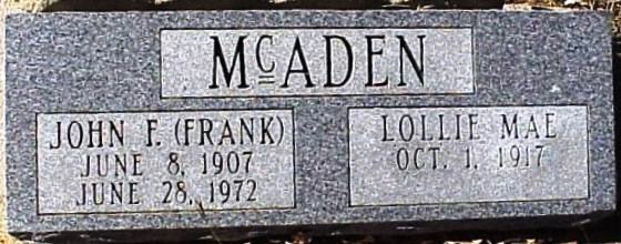 ![]() ![]() Ada E. McAden 1885 - 1935 J.C. McAden 1872 - 1954 ![]() John Frank McAden 8 June 1907 - 28 June 1972 Lollie Mae McAden 1 October 1917 - ![]() Harold W. McAden 27 February 1914 - 27 October 1995 ![]() Georgetown Cemetery Susan Hawkins © 2024 If you find any of Grayson County TXGenWeb links inoperable, please send me a message. |