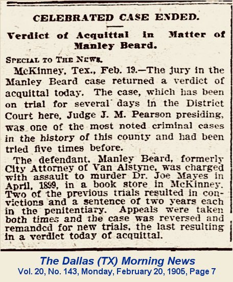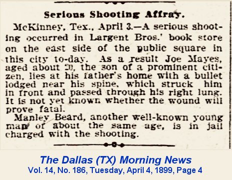 McKinney, Texas Thursday, April 13, 1899 pg.1 WAIVED EXAMINING TRIAL Manly Beard, who shot Joe Mayes, waived his examining trial before Justice Terrell and was allowed bond in the sum of $1500. He readily gave the bond this morning and also another one, $500, for attempting to shoot Ed Largent, and was released. The following gentlemen are his bondsmen: S. Fitzhugh, A.J. Chin, John C. Cooke, S.P. Coffey, J.L. Gibson, J.H. Graves, L.S. Coffman, H.E. Morgan and T.E. Shirley. ![]() Manley