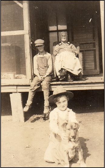 Nancy Hoover Clountz & William Clounts on porch; Birtie Clontz with his dog