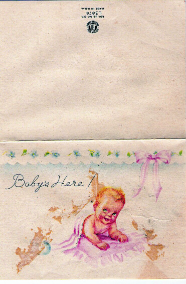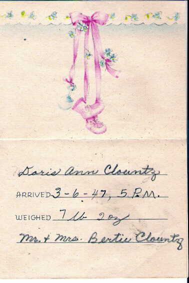 Doris Clountz's birth announcement - front and inside d/o Bertie & Annie Clountz written to Aunt Abbie Myers Daniel, sister of Doris' grandmother Minnie Myers Clountz