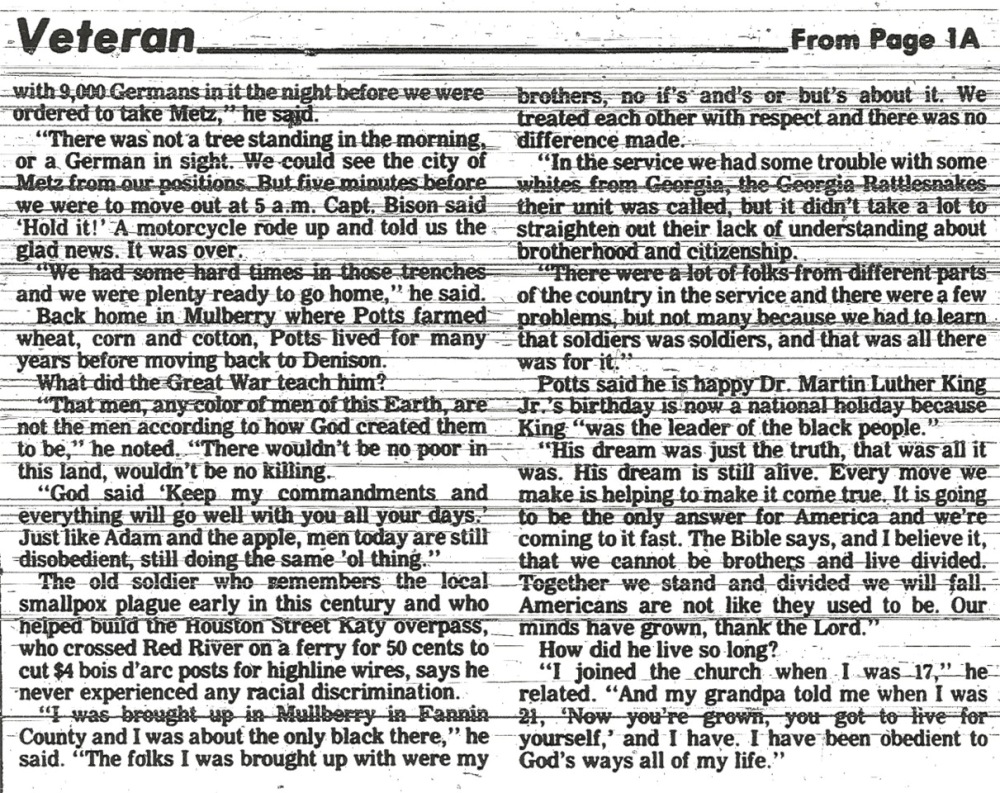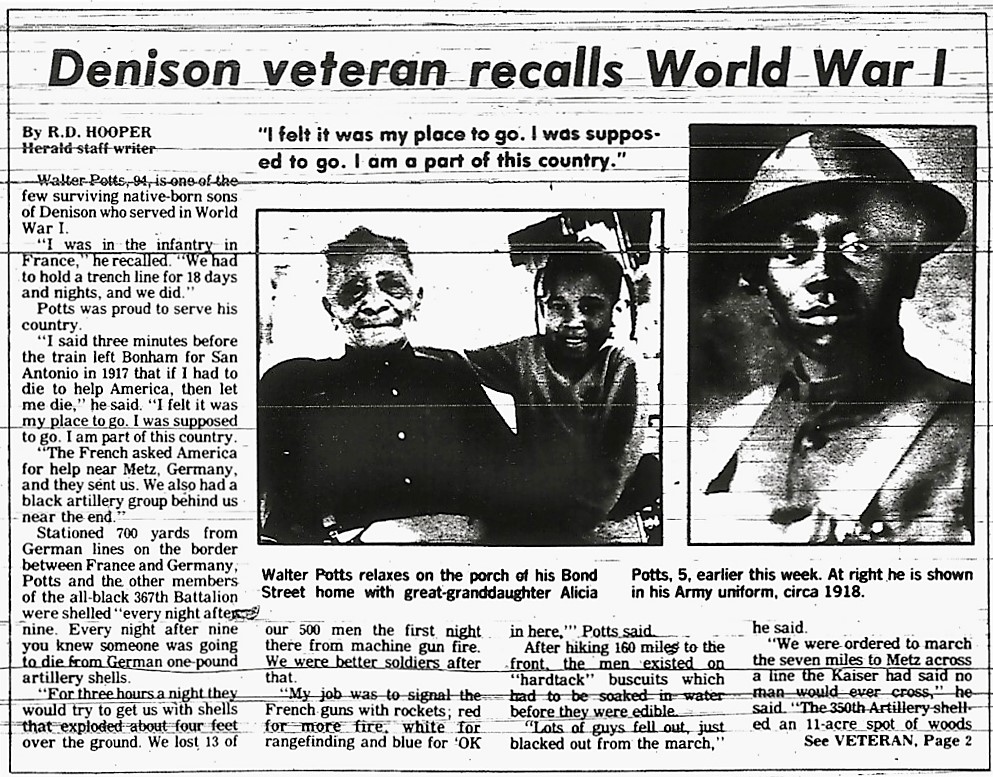 Walter Potts was born in 1892 and lived in Denison, Texas. He was a family friend of the Dupree & Holland families. His descendant, Eva B. Hogan, wrote his biography "The Last Buffalo". ![]() ![]() Walter Potts is buried at Magnolia Cemetery, Denison, Grayson Co., Texas Fannin Co. TXGenWeb obituary He is the subject of the book, The Last Buffalo : Walter E. Potts & the 92nd "Buffalo" Division in World War I, by E.B. Hogan Biography Index Susan Hawkins ©2025 If you find any of Grayson County TXGenWeb links inoperable, please send me a message. |