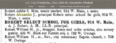 The 1891 Denison TX City Directory listed a new member of the Robert clan—Alexander John Robert (1828–1915). Alex was a younger brother of Rev. W.H. Robert Sr. (1821–1900). In 1891, he was principal of Robert Select School for Girls, which he operated in his home at 914 West Main Street. From an educational standpoint, he was well equipped for such a role. He had taken a B.A. degree at Brown University in 1844, attended the U.S. Military Academy at West Point for one year in 1845, then received his A.M. degree at Yale University in 1851. He also had a law degree.  In the Civil War, he had been a Confederate officer in Company E, Georgia 4th Infantry Regiment.   He was promoted to Full 2nd Lieutenant and then to Full 4th Lieutenant on May 10, 1861.  Promoted to Full Adjutant on August 15, 1862