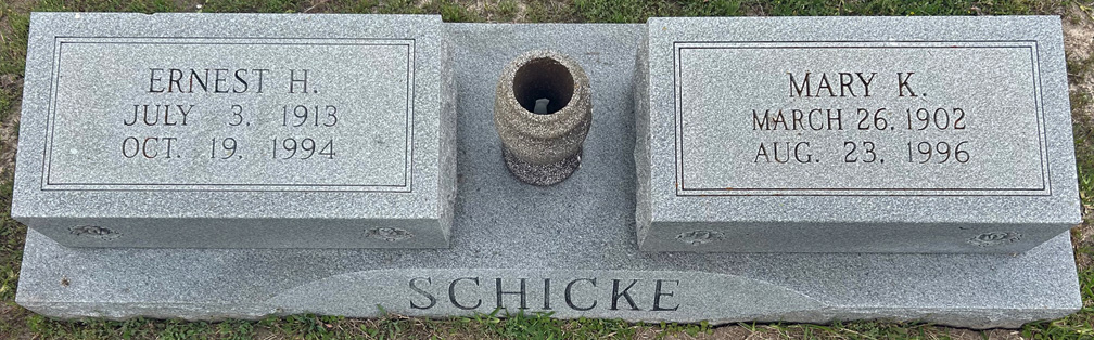 Funeral services for Ernest H. Schicke, 81, of Blessing, were held Oct. 21, 1994 at the Palacios Funeral Home Chapel in Palacios with Rev. Ron Lynn officiating. Interment was in Palacios Cemetery. Mr. Schicke was born July 3, 1913 in Milwaukee, Wis. to Charles and Minnie C. Osterman Schicke. He died Oct. 19, 1994 at his residence in Blessing. He was a member of the First Baptist Church in Blessing. A veteran of World War Ii, he was a member of the V. F. W. Post 2467 in Palacios, a member of the Cecil Lee American Legion Post 649 in Blessing. He had resided in Blessing for the past 12 years after moving from the Schicke Point Community. He is survived by his wife, Mary K. Schicke of Blessing; a sister, Dorothy Anders of Lolita; a brother, Warrie W. Schicke of Schicke Point Community; a niece, Christine Slaven of Victoria; and a number of other nieces and nephews. Pallbearers were Gus Franzen, Earl Adams, Kenneth Peterson, G. W. Franzen, Wesley Franzen and Derril Franzen. Honorary pallbearers included Britt Murray and Andrew Murray. Palacios Beacon, October 26, 1994