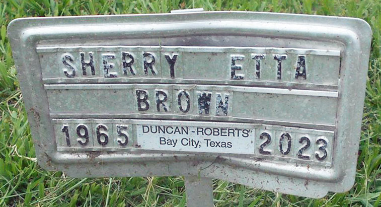 Sherry Etta Brown, 58, of Bay City, Texas, passed away Thursday, December 28, 2023, in Bay City. Visitation and guest book registry will be on Friday, January 12, 2024, from 2 p.m. until 7 p.m. at the Duncan-Roberts Funeral Home Chapel in Bay City. Funeral services will be held Saturday, January 13, 2024, at 11 a.m. at New Hope Baptist Church in Bay City, with pastor Dr. T.L. Richardson, eulogist. Burial will follow at Eastview Cemetery in Bay City. Survivors include her son, Darien Brown; two sisters, LaTanga Wilson and Pamela Stone; three brothers, David Steamer, Johnny Brown and Robert Lee Brown; and a host of aunts and uncles, nieces and nephews, and an enormous host of other relatives and many friends. Those preceding her death include her parents, Johnny Brown and Shirley Ray Brown; a son, Derick Brown; three sisters, Gladys Edison, Carol Steamer and Diane Steamer; and one brother, Johnny Brown Jr. Condolences may be sent to the family by fax 979-245-1537 or by email at roberts315@yahoo.com Arrangements by Duncan-Roberts Funeral Home, Bay City, Texas 77414, 979-245-5197. Bay City Tribune, January 10, 2024 Photo courtesy of Faye Cunningham
