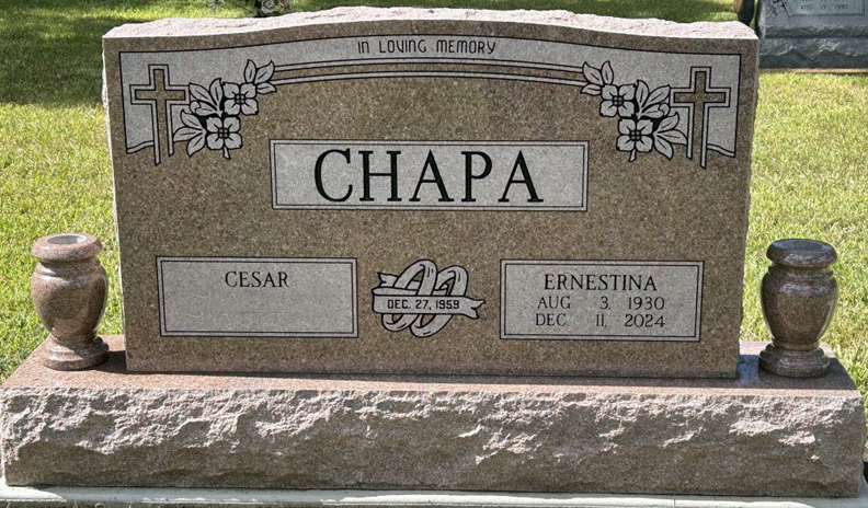 Ernestina Chapa, 94, of Van Vleck passed away December 11, 2024. She was born August 3, 1930 in San Benito, Texas to the late Santos De La Rosa and Cecelia De La Rosa. The Chapa family originally lived in Harlingen TX until they moved to the Bay City area in 1977. They then moved to Van Vleck to enjoy retirement. She always looked forward to visits from her family especially the grandchildren and great grandchildren. Ernestina was well known in the area for her wonderful homemade tamales. In addition to her parents, she was preceded in death by her daughter Maricela Chapa Kubeczka and her son Noel Chapa Sr. Survivors include her husband Cesar Chapa Sr.; sons Rolondo Chapa (Dareth), Cesar Chapa (Marilyn Ball), Eduardo Chapa (Susie) and Oscar Chapa; 13 grandchildren and 5 great grandchildren. Visitation will be from 4:00 PM until 6:00 PM Wednesday, December 18, 2024 at Taylor Bros. Funeral Home. A rosary will be recited at 9:30 AM Thursday, December 19, 2024 at Our Lady of Guadalupe Catholic Church. Funeral Mass will follow at 10:00 AM with Rev. Gabriel Espinosa officiating. Interment will follow at Cedarvale Cemetery. Pallbearers will be Noel Chapa, Joel Chapa, Gregory Chapa, Michael Chapa, Nick Chapa, Alex Chapa, Andrew Chapa, Lilly Chapa. Donations in lieu of flowers may be made to Our Lady of Guadalupe. Taylor Bros. Funeral Home Photo courtesy of Faye Cunningham
