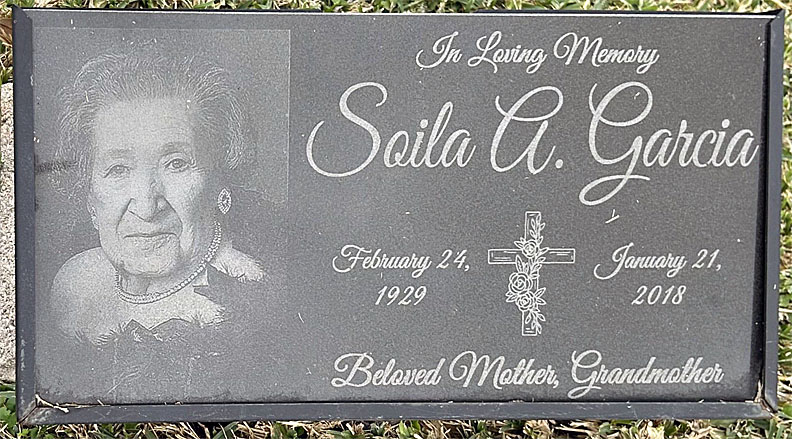 Soila A. Garcia, 88, of Bay City passed away January 21, 2018. She was born February 24, 1929 in Premont, TX to the late Genero Garcia and San Juanita Medrano Garcia. Soila was preceded in death by her parents; husband Jesus Garcia, Sr., 3 sisters and 2 brothers. She is survived by children Esther Gomez (Joe), Jesse Garcia, Jr. (Theresa), Josue J. Garcia and Saul Garcia (Sylvia); sister Mara G. Garcia; 18 grandchildren, 45 great grandchildren and 7 great-great grandchildren. The family will receive friends and relatives from 5PM until 7PM Thursday at the funeral home. A prayer service will begin at 6:00 PM. Funeral services will be 10:00 AM Friday, January 26, 2018 at Taylor Bros. Funeral Home with Pastor Saul Garcia officiating. Interment will follow at Cedarvale Cemetery. Pallbearers are Joshua Garcia, Trystan Gonzalez, Kyle Espinoza, Brian Garcia, Saul Robles and Silas Robles. Taylor Bros. Funeral Home Marker photo courtesy of Faye Cunningham