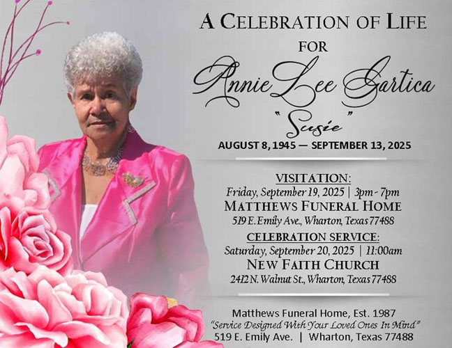 Josephine Garcia, 76, of Bay City, TX passed away peacefully on October 28, 2025 surrounded by her loved ones. She was born September 19, 1949 in Houston, TX to the late Augustina Lopez Garcia. Josephine was a devoted mother, grandmother, and friend. She will be remembered for her kindness, strength, and the love she shared with everyone who knew her. Josephine is preceded in death by her mother, and siblings Janie Lopez, Frank Garcia, Alfonso Garcia, Jupe Garcia, Thomas Garcia and Augustina Zavala. She is survived by her husband, Baldemar Garcia; children Dora Tanner, Baldemar Garcia, Jr., Nancy Garcia, Paul Garcia and Rebecca Hernandez; brother Joe Garcia; twenty-two grandchildren; 24 great-grandchildren; 5 great-great grandchildren. She will be deeply missed and forever remembered with love. The family will receive relatives and friends Monday, November 3, 2025 from 8:00 am – Noon at Taylor Bros. Funeral Home in Bay City, TX.