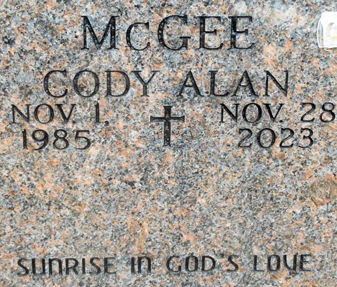 Cody Alan McGee, 38, of Bay City passed away November 28, 2023. He was born November 1, 1985 in Bridgeton, New Jersey to Gary Don McGee and Cathy Ann Nelson McGee. Cody was a very loving young man. He leaves behind a tremendous hole in the hearts of his parents, family and friends who knew him. His beloved pets, Abby, Bella and Milly, mourn his loss also. Survivors include his parents Gary and Cathy McGee; brother Les McGee and his wife Nisse; nephew Jackson McGee; uncle Eddie McGee; his uncle Whit Nelson and wife Susan; great aunt Judy Brown; great aunt Anita Lewis; special buddy Jakob Donohue and numerous cousins and other extended family members. A Celebration of his Life will be held at 2:00 PM Friday, December 8, 2023 at Nichols St. Church of Christ with Matt Springfield officiating. In lieu of flowers, please honor his memory with a donation to re:Mind Depression and Bipolar Support by visiting remindsupport.org. A forever sunrise In the presence of God's forever love. Taylor Bros. Funeral Home Photo courtesy of Faye Cunningham