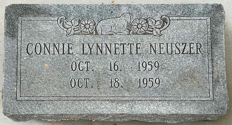 Connie Lynette Neuszer, infant daughter of Mr. and Mrs. Leo Neuszer, Jr., of Markham, died Sunday at 10 p. m. at the Matagorda General Hospital. Besides the parents the baby is survived by one sister, Carol. Funeral services were set for 3 p. m. Tuesday at the First Baptist Church in Markham. Interment in Hawley cemetery. Rev. Jerry Lyons, officiating. Daily Tribune, October 19, 1959