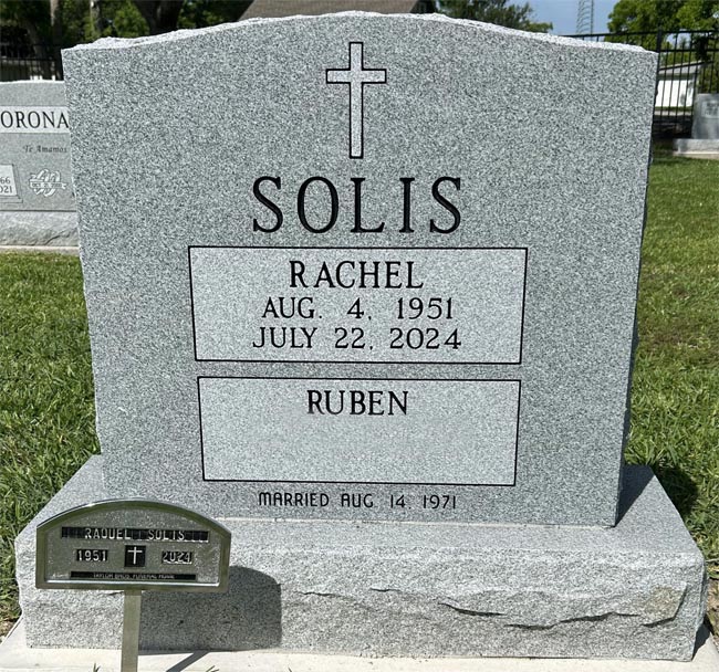 Raquel “Rachel” Solis, 72, of Richwood, TX passed away July 22, 2024. She was born August 4, 1951 in Mathis, Texas to the late Raul Franco and Sarah Zepeda Franco. Rachel retired from Dow Chemical after 35 years of service. Rachel enjoyed reading, cooking, hanging out with her family & friends and never missed the opportunity to celebrate life. In addition to her parents, she was preceded in death by her brother Raul Franco, Jr. Survivors include her husband Ruben Solis; daughter Felicia Neubig and husband Pete; sisters Ruby Franco, Sylvia Bartley & husband Gary, Becky Ortiz and Ruth Littlefield and husband Travis. A rosary will be recited at 9:30 AM Friday, August 23, 2024 at Our Lady of Guadalupe Catholic Church. Funeral Mass will be at 10:00 AM with Rev. Gabriel Espinosa officiating. Interment will follow at Cedarvale Cemetery. Taylor Bros. Funeral Home Photo courtesy of Faye Cunningham