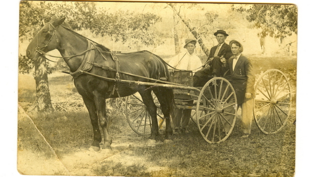 Stephen Leon Stuart (left), Grover Cleveland Stuart in buggy, Guy Mortimer Stuart (right)
