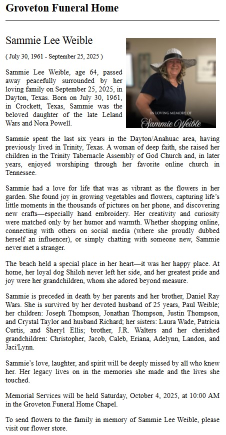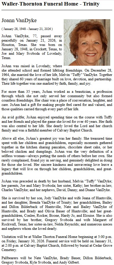 | VAN | Betty Jo Cook | Groveton Funeral Home | 7/12/2016 |