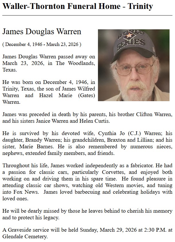 | VANACEK | Joe Wayne | Trinity County News Standard | 11/21/2019 |