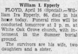 1900: 1910 Residence: Floyd Co., VA, Alum Ridge District 41, H94: ...... Eperly, William I. 53 yo w/m, b. VA, parents b. VA, M1 30y, cannot read or write, owns farm, HOH. ............ Sarah M. 42 yo wife, b. VA, parents b. VA, M1 30y, 1 ch with 1 living. ...... Bowers, Willie 30 yo widowed daughter, b. VA, parents b. VA, 2 ch with 2 living. [bower2] ............ Thurman 6 yo grandson, b. VA, parents b. VA. ............ Roy 3 yo grandson, b. VA, parents b. VA. 1914 Marriage #1: W. I. Epperly m. Lillie P. Roop 11-1-1914 at Archie G. Wells Floyd Co., VA by Archie G. Wells, Minister of the Methodist Church. He 49 yo widowed w/m farmer, b. & living in Floyd Co., VA, s/o Solomon & Rachel Epperly. She 30 yo single w/f, b. & living in Floyd Co., VA, d/o J. M. & Josie C. Roop. Lillie Prince Roop, 1884-1969, d/o James Merritt & Josephine Catherine (Peterman) Roop. She is buried in the White Oak Grove Cemetery, Floyd Co., VA. [Roop] 1920 Residence: Floyd Co., VA, Alum Ridge District 88, H50: ...... Epperly, 63 yo w/m farmer, b. VA, parents b. VA, cannot read or write, owns, HOH. ............ Lillie P. 35 yo wife, b. VA, parents b. VA, cannot write. ............ Zora E. 3y 4/12 daughter, b. VA, parents b. VA. 1930 Residence: Floyd Co., VA, central part of Alum Ridge District 1, H147: ...... Epperly, Will I. 73 yo w/m farmer, b. VA, parents b. VA, 18 yo when 1st married, cannot read or write, owns, HOH. ............ Lilly P. 55 yo wife, b. VA, parents b. VA, 37 yo when 1st married, cannot read or write. ............ Zora E. 13 yo daughter, b. VA, parents b. VA, school. 1940 Residence: Floyd Co., VA, Alum Ridge District 32-1, SR 617, H13: ...... Jones, Luther 52 yo w/m farmer, b. VA, completed G7, resided in same place 1935, rents, HOH. ............ Elizabeth 23 yo wife, b. VA, completed G7, resided in same place 1935, housework. ............ Bobby 5 yo son, b. VA, completed G0. ............ Dollie 3 yo daughter, b. VA, completed G0. H14: ...... Epperly, William 83 yo father in law, b. VA, completed G1, resided in same house 1935, owns, HOH. ............ Lillie 54 yo mother in law, b. VA, completed G3, resided in same house 1935, housework. 1942 Death: 4-16-1942 Floyd Co., VA. [Death Cert – can’t find] 1942 Obit: