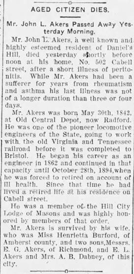 Parents: Charles C. & Elizabeth (Franklin) Akers. 1840 Birth: 3-31-1840 Montgomery Co., VA. 1850 Residence: Montgomery Co., VA with parents. 1864 Marriage #1: John Lynch Akers m. Henrietta Burford 3-16-1864 Lynchburg VA. He 21 yo single w/m, b. Montgomery Co., VA, s/o Charles & Elizabeth Akers. She 19 yo single w/f, b. Lynchburg, VA, d/o George W. & Lucinda Burford. Henrietta