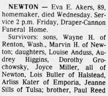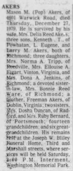 Parents: Arteamus Dudley & Sarah Ellen (Turpin) Akers. 1902 Birth: 1-23-1902 Floyd Co., VA. 1910 Residence: Floyd Co., VA with parents. 1920 Residence: Pulaski Co., VA with parents. 1922 Marriage #1: Mason M. Akers m. Delia S. Reed 2-15-1922 Floyd Co., VA. He 21 yo single w/m, b. Floyd Co., VA, s/o A. D. & Sarah E. Akers. She 17 yo single w/f, b. Floyd Co., VA, d/o Spencer & Laura Reed. 1930 Residence: McClean Co., IL, Mount Hope District 53, H33: Reed, Mason M. 29 yo w/m grain farm laborer, b. VA, parents b. VA, 21 yo when 1st married, rents, vet?: no, HOH. Delia 25 yo wife, b. VA, parents b. VA, 17 yo when 1st married. Kenneth T. 7 yo son, b. VA, parents b. VA. Eugene L. 4 yo son, b. IL, parents b. VA. 1940 Residence: Henrico Co., VA, Varina District 44-34, Oakland Road, H15: Akers, Mason M. 39 yo w/m dairy milker, b. VA, completed G7, resided in same place 1935, rents, HOH. Delia S. 35 yo wife, b. VA, completed H2, resided in same place 1935, housework. Kenneth T. 17 yo son, b. VA, completed H3, resided in same place 1935, school. Eugene L. 15 yo son, b. IL, completed G1, resided in same place 1935, school. Norma Lee 9 yo daughter, b. IL, completed G3, resided in same place 1935, school. Eloise 6/12 daughter, b. VA, completed G0. Reed, Bonnie 16 yo single sister in law, b. VA, completed H2, resided in Floyd Co., VA 1935, other work. 1979 Death: 12-27-1979 Richmond, Chesterfield Co., VA. [Death Cert]