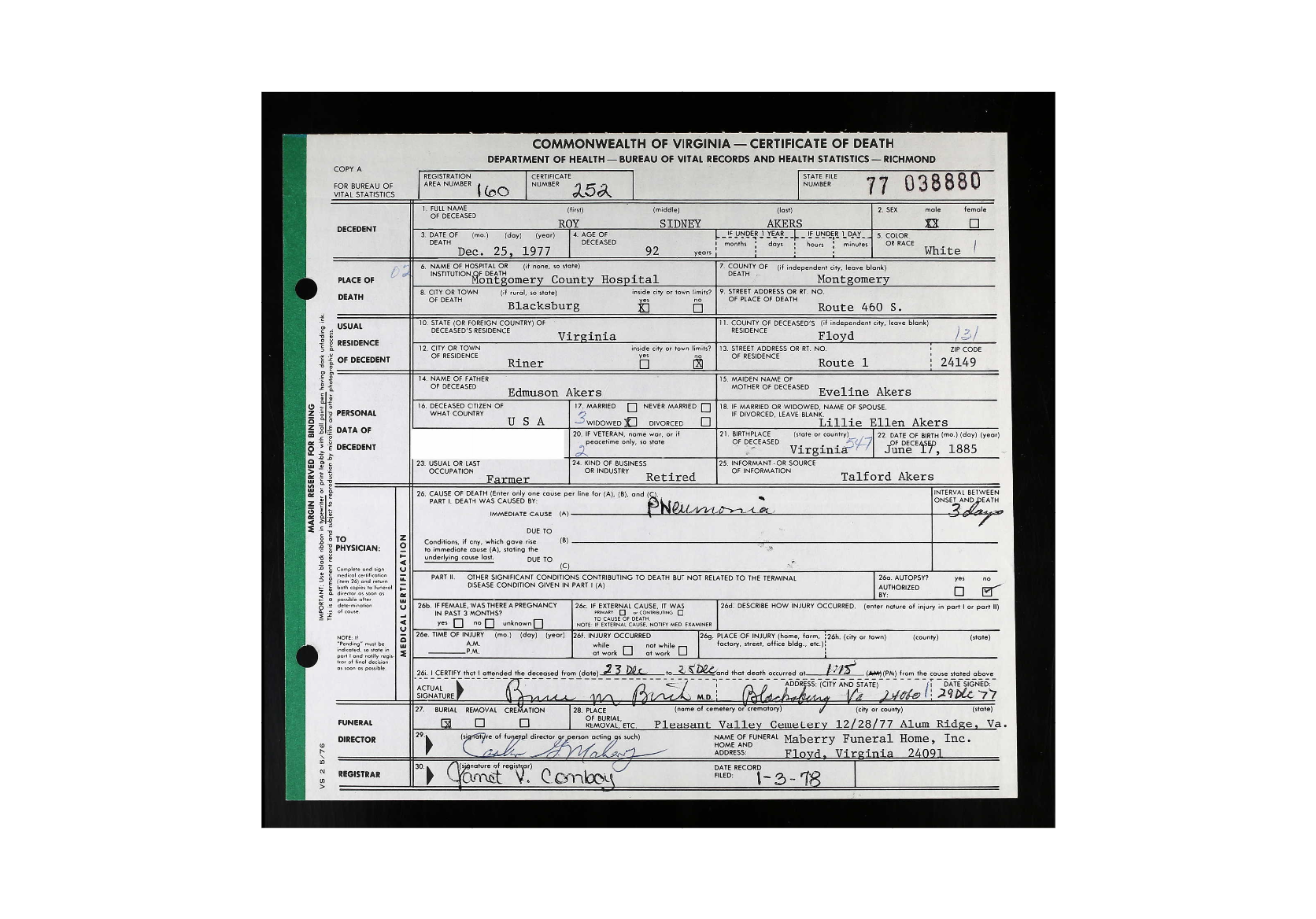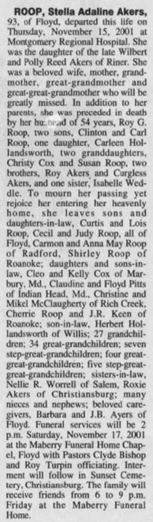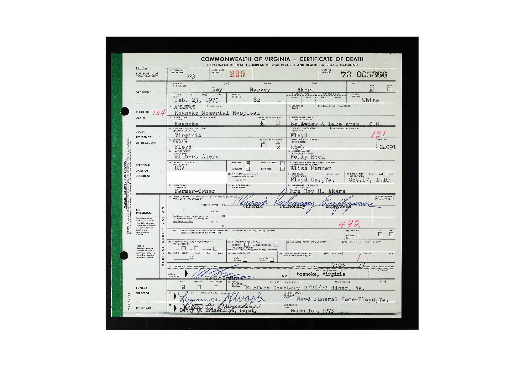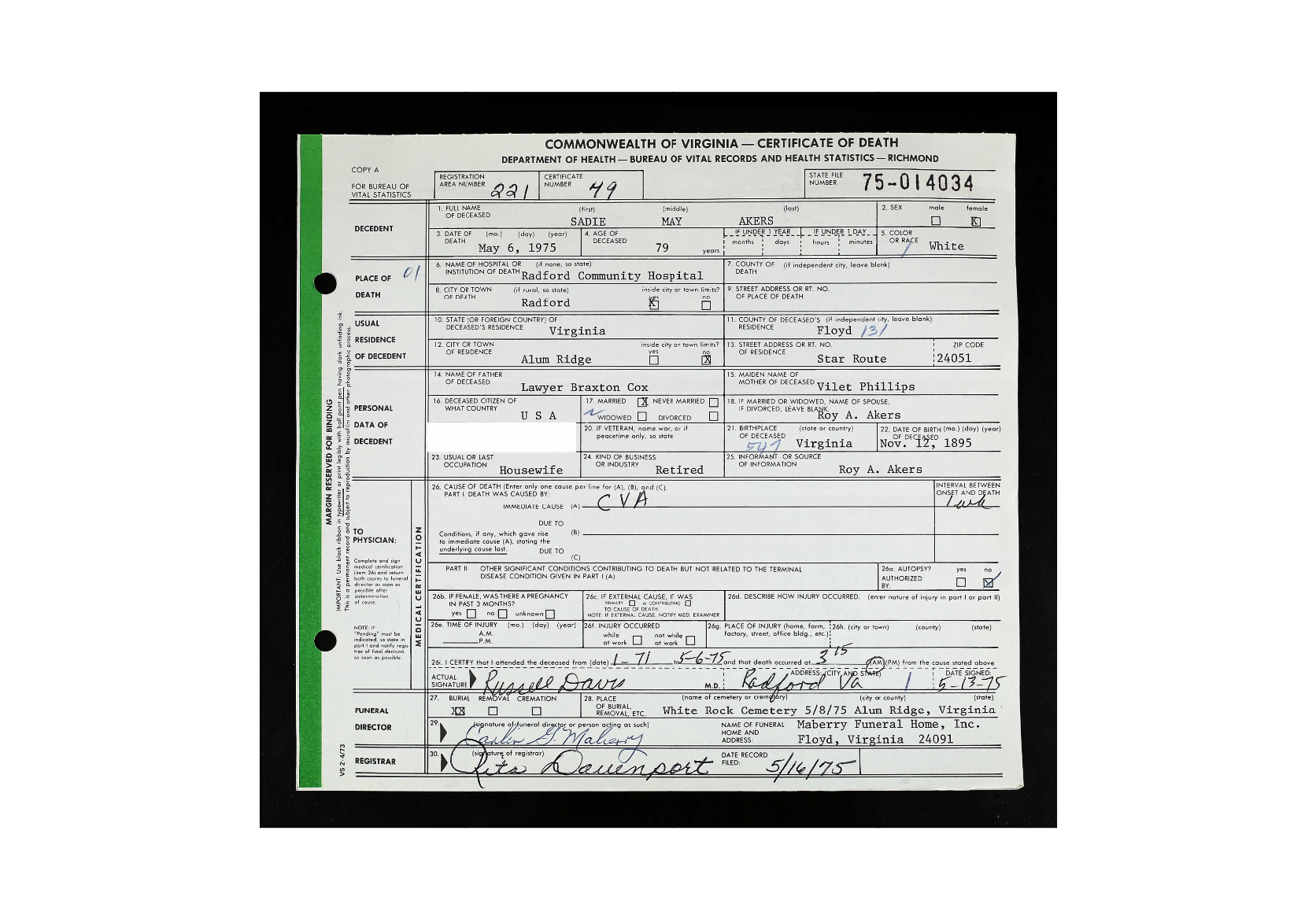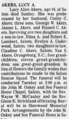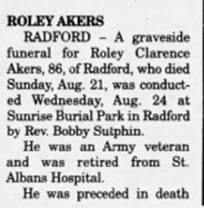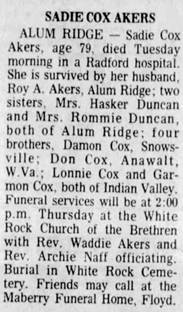 Sadie 42 wife, b. VA, completed G5, resided in same house 1935, housework. 1942 Registration Card: Roy Arville Akers, 47 yo w/m of Carthage, Floyd Co., VA, b. March 29, 1895 Floyd Co., VA, person who will always know address: Mrs. Roy A. Akers, employer: self, 5 11 175 lbs, blue eyes, bald, ruddy complexion. 1987 Death: 10-21-1987 VA Hospital, Salem, VA but of 1525 Roanoke St, Christiansburg, Montgomery Co., VA. [Death Cert] Roy Arville Akers, 92 yo widowed w/m sawmill operator, b. Mar 29, 1895 VA. Spouse: Sadie Cox Akers. Father: William C. Akers. Mother: Mary Jane Alley. COD: sepsis, probable pneumonia, renal failure. Burial: White Rock Cemetery, Alum Ridge, VA.