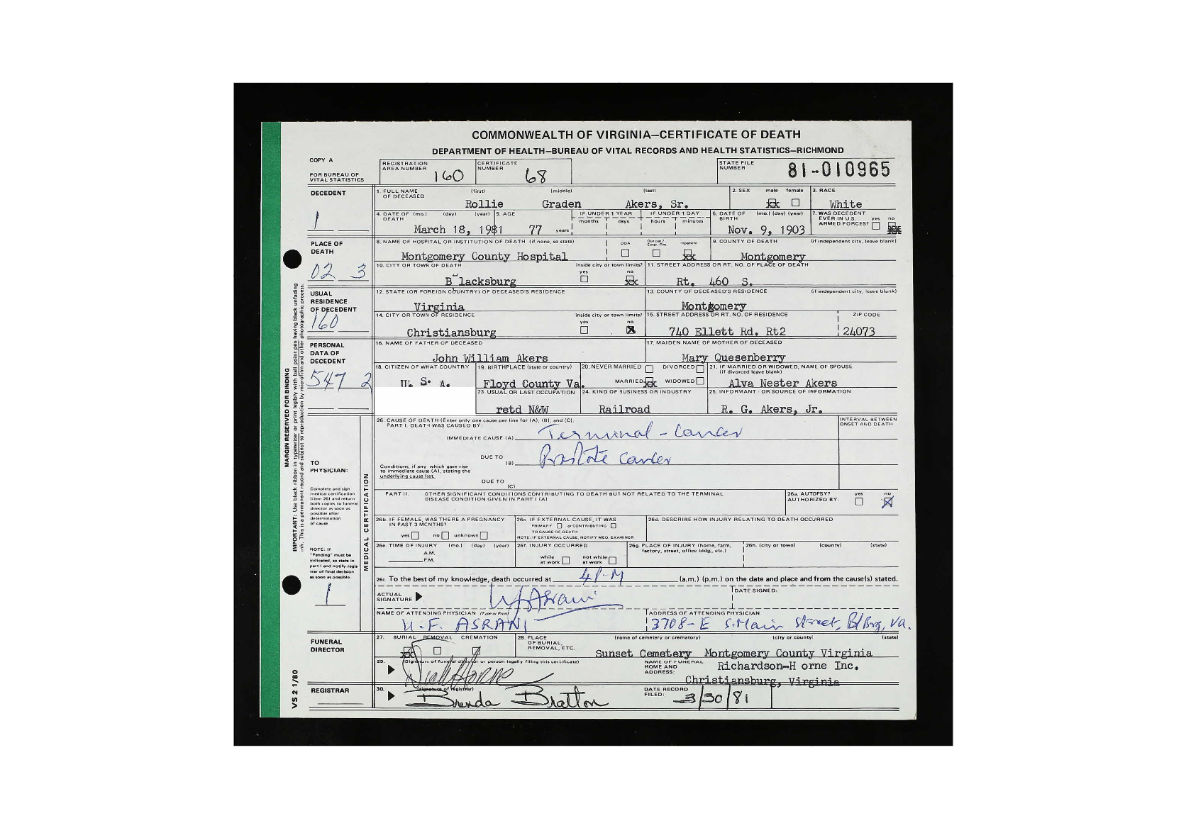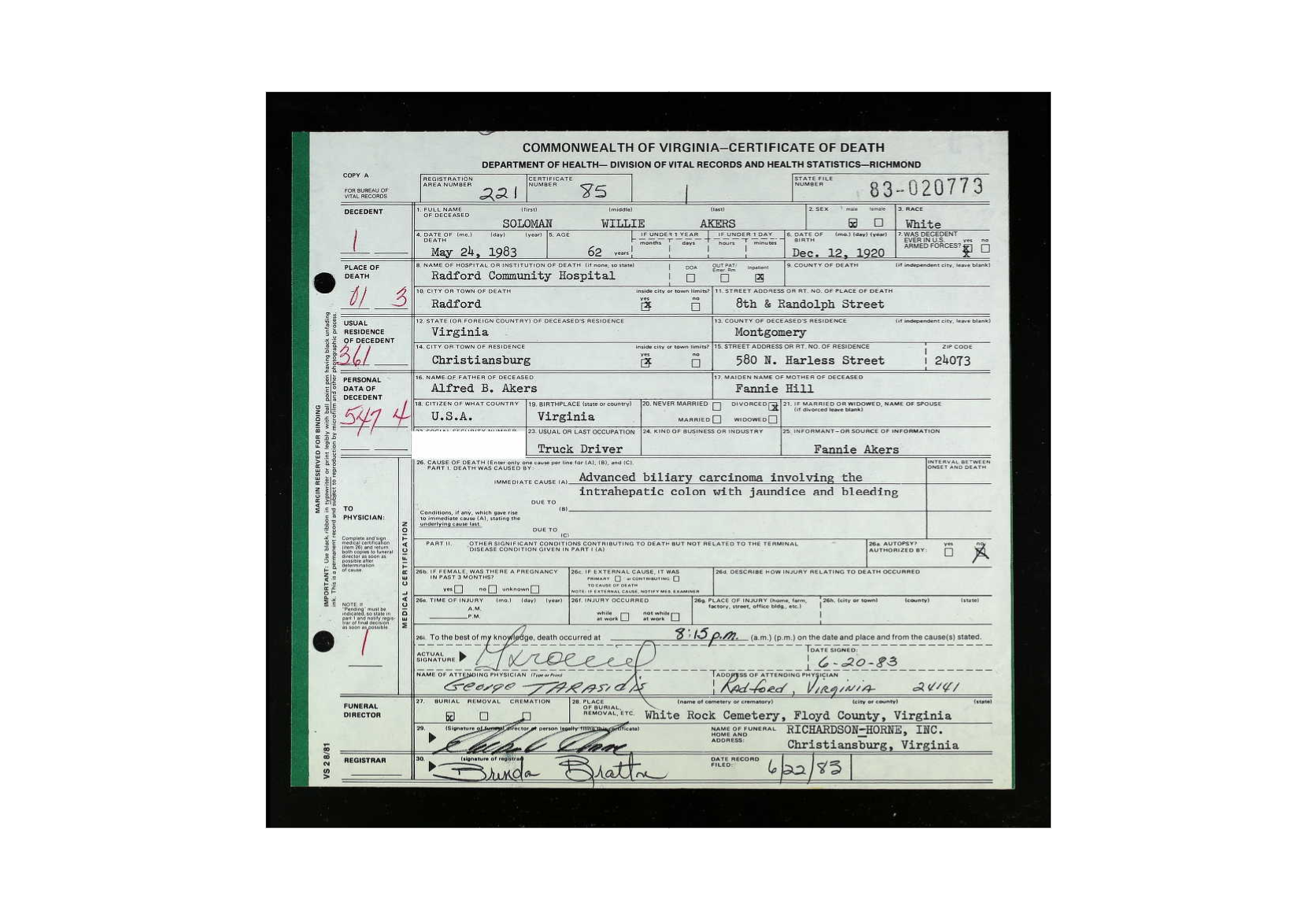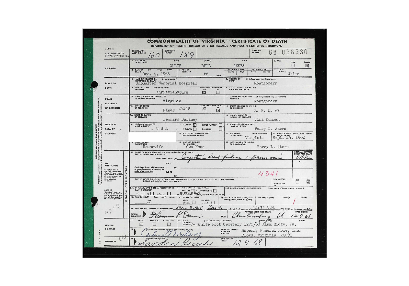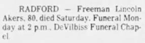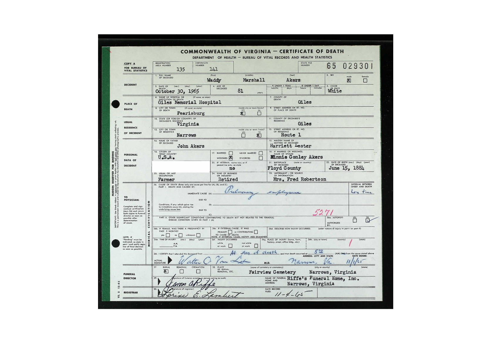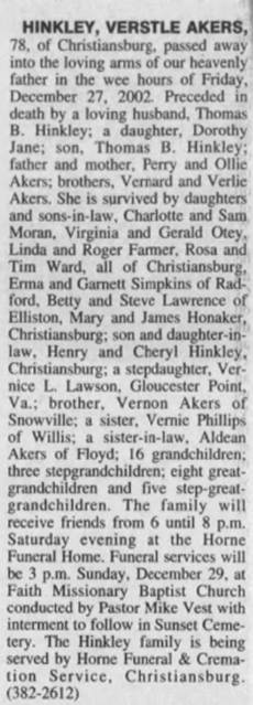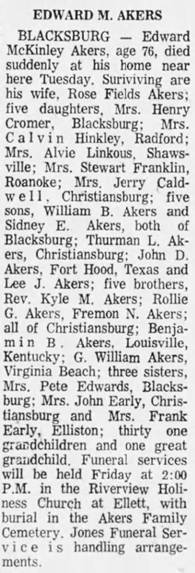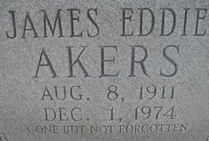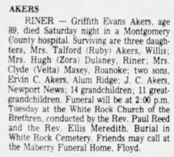 Parents: James Wallace & Arminta Alice Mintie (Flinchum) Akers. 1906 Birth: 12-6-1906 Narrows, VA. (src: delayed birth record noted to be the 5th child born to James Wallace Akers & Mintie Allice Flenchum.) 1910, 1920, 1930 Residence: Giles Co., VA with parents. Marriage #1: Ole Mae Lawson Ole Mae Lawson, 1907-2004, d/o Samuel Scott & Drucy Eliza (Lawson) Lawson. [no file] 1984 Death: 4-12-1984 Giles Memorial Hospital, Pearisburg, Giles Co., VA but of 151 Woodlawn St, Narrows, Giles Co., VA. James Blaine Akers, 77 yo married w/m textile plant laborer, b. Dec 6, 1906 VA. Spouse: Ola Lawson Akers. Father: James Wallace Akers. Mother: Mintie Flinchum. Informant: Ola Lawson Akers. COD: disseminated intravascular coagulopathy; multiple blood transfusions; ruptured aortic aneurysm; chronic renal failure; hypertension. 1984 Burial: Fairview Cemetery, Narrows, Giles Co., VA.