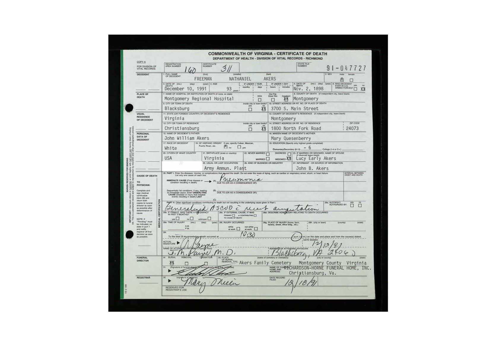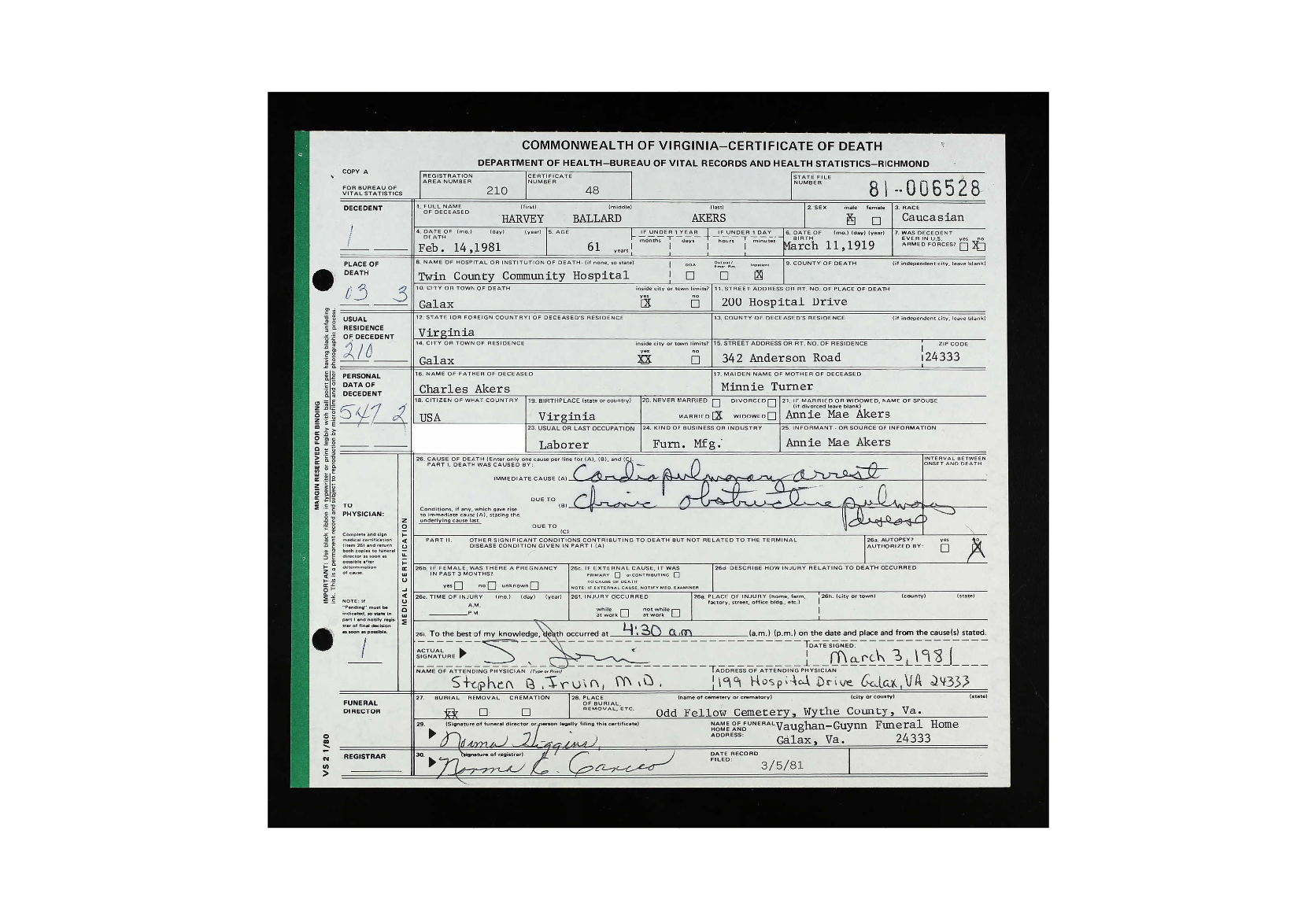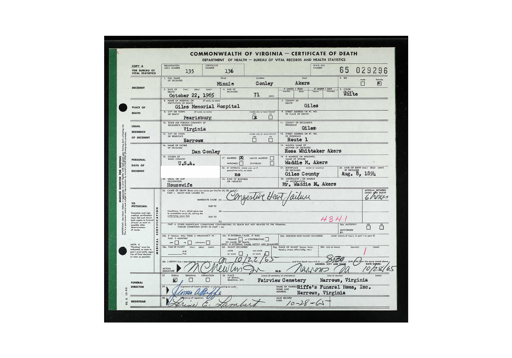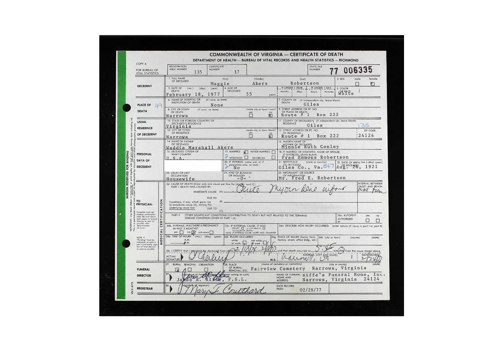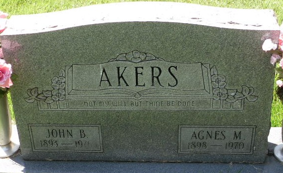 Parents: James Wallace & Arminta Alice Mintie (Flinchum) Akers. 1906 Birth: 12-6-1906 Narrows, VA. (src: delayed birth record noted to be the 5th child born to James Wallace Akers & Mintie Allice Flenchum.) 1910, 1920, 1930 Residence: Giles Co., VA with parents. Marriage #1: Ole Mae Lawson Ole Mae Lawson, 1907-2004, d/o Samuel Scott & Drucy Eliza (Lawson) Lawson. [no file] 1984 Death: 4-12-1984 Giles Memorial Hospital, Pearisburg, Giles Co., VA but of 151 Woodlawn St, Narrows, Giles Co., VA. James Blaine Akers, 77 yo married w/m textile plant laborer, b. Dec 6, 1906 VA. Spouse: Ola Lawson Akers. Father: James Wallace Akers. Mother: Mintie Flinchum. Informant: Ola Lawson Akers. COD: disseminated intravascular coagulopathy; multiple blood transfusions; ruptured aortic aneurysm; chronic renal failure; hypertension. 1984 Burial: Fairview Cemetery, Narrows, Giles Co., VA.