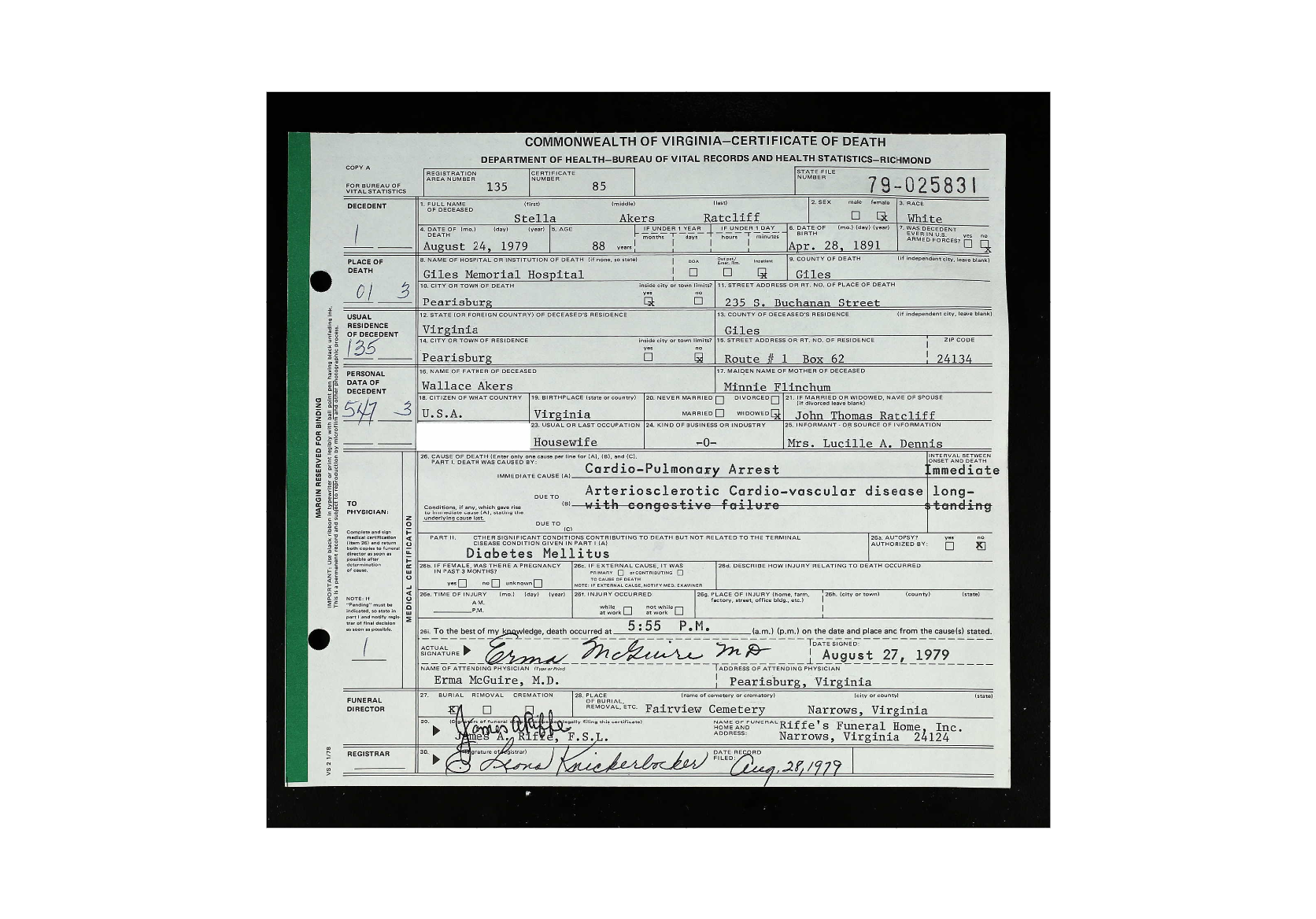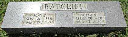 1884-1957, s/o Martin Luther & Martha Ann (Ratcliff) Ratcliff. [Death Cert] [no file] 1979 Death: 8-24-1879 Giles Memorial Hospital, Pearisburg, Giles Co., VA but of Rt #1, Box 62, Pearisburg, Giles Co., VA. [Death Cert] Stella Akers Ratcliff, 88 yo widowed w/f, b. Apr 28, 1891 VA. Spouse: John Thomas Ratcliff. Father: Wallace Akers. Mother: Minnie Flinchum. Informant: Mrs. Lucille A. Dennis. COD: cardio-pulmonary arrest immediate. Burial: Fairview Cemetery, Narrows, VA. No burial date. 1979 Burial: Fairview Cemetery, Narrows, Giles Co., VA.
