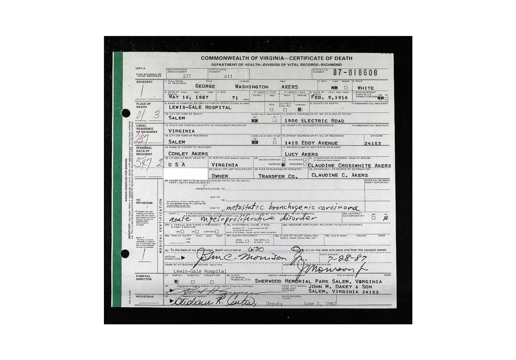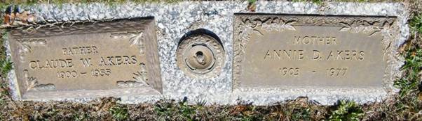 Parents: James Wallace & Arminta Alice Mintie (Flinchum) Akers. 1900 Birth: 3-1-1900 VA. 1910, 1920 Residence: Giles Co., VA with parents. 1923 Marriage #1: Anna Dora Johnson abt 1923. 1930 Residence: Ashe Co., NC, West Jefferson Town, College Ave, H44: Akers, Claude Sr 29 yo w/m works on steam railroad, b. VA, parents b. VA, 22 yo when married, HOH. Annie 26 yo wife, b. VA, parents b. VA, 19 yo when married. George W. 5 yo son, b. VA, parents b. VA. Claude Jr. 2 yo son, b. VA, parents b. VA. 1955 Death: 7-24-1955 Lewis-Gale Hospital, Roanoke City, VA but of Box 833 Radford, VA. Claude William Akers, 55 yo married w/m asst N. & W. R.R. foreman. Veteran: not asked. Spouse: Annie Akers. Father: Wallace Akers. Mother: Minnie Flinchum. Informant: hospital records. COD: ileus adynamic 4 days; partial intestinal obstruction 4 days; P.O. resection CA rectum 12 days; uremia secondary 48 hours. Burial: Radford Cemetery, Radford, VA, July 26, 1955. 1955 Burial: Sunrise Burial Park, Fairlawn, Pulaski Co., VA.