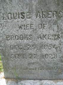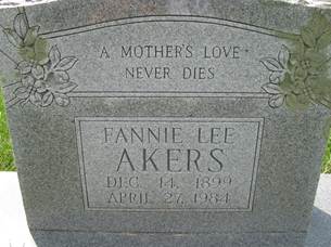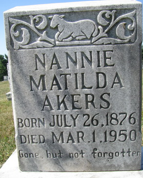 Parents: Jonathan A. & Harriet E. (Lester) Akers. 1869 Birth: 11-8-1869 Floyd Co., VA. (src; FCVA birth record) 1870 Residence: Floyd Co., VA with parents. 1880 Residence: Montgomery Co., VA with parents. 1890, 1900 Residence: Floyd Co., VA with parents. 1908 Death: 6-26-1908. 1908 Burial: Fletchers Cemetery, Giles Co., VA.