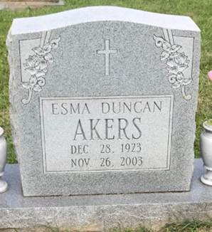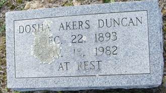 Parents: Arteamus Dudley & Sarah Ellen (Turpin) Akers. 1892 Birth: 12-1892 Floyd Co., VA. 1900, 1910 Residence: Floyd Co., VA with parents. 1910 Marriage #1: Dosie Akers m. Homer Duncan 12-28-1910 Copper Valley, Floyd Co., VA by Eld. J. M. Phillips, Minister of the Primitive Baptist Church. He 23 yo single w/m farmer, b. & living in Floyd Co., VA, son Asa & Nancy Duncan. She 17 yo single w/f, b. & living in Floyd Co., VA, d/o Dudly & Ellen Akers. Homer Lee Duncan, s/o Asa & Nancy (Duncan) Duncan. [Death Cert] [Duncan_Benjamin_Nancy] 1982 Death: 11-18-1982 Bedspring, Pulaski Co., VA. [Death Cert]