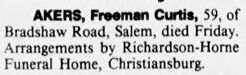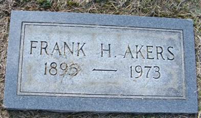 Parents: Arteamus Dudley & Sarah Ellen (Turpin) Akers. 1894 Birth: 10-15-1894 Copper Valley, Floyd Co., VA. 1900, 1910 Residence: Floyd Co., VA with parents. 1917 Registration Card: Frank Akers, 22 yo w/m of Wheatland, North Dakota, b. Oct 15, 1894 Copper Valley, Virginia, farm hand for W. F. Schultz of Gill Twp., ND, medium height & build, blue eyes & light hair. Dated June 5, 1917 Gill Precinct, Cass Co., ND. 1927 Marriage #1: Nannie Haven Linkous 1927. Nannie Haven Linkous, 1909-1937, d/o James William & Mary Ann (Anderson) Linkous. Marriage #2: Mary Farmer. Mary Farmer, d/o Robert Graham & Mary Emeline (Duncan) Farmer. 1920: too many possibilities. 1942 Registration Card: cant find. 1973 Death: 10-18-1973 Radford, VA but of Belspring, Pulaski Co., VA. [Death Cert]