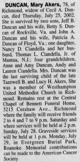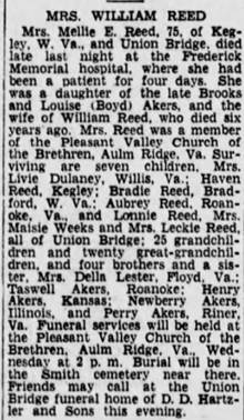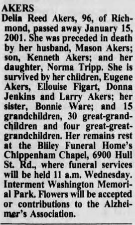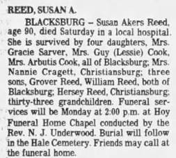 Parents: Spencer Abram & Laura B. (Duncan) Reed. [Reed_Spencer_Margaret] 1904 Birth: 10-7-1904 Floyd Co., VA. 1930 Residence: McClean Co., IL with husband Mason M. Akers. 1940 Residence: Henrico Co., VA with husband Mason M. Akers. 2001 Death: 1-15-2001 Richmond, Chesterfield Co., VA.