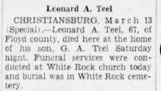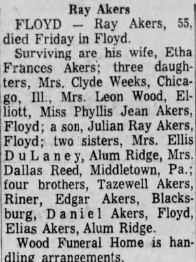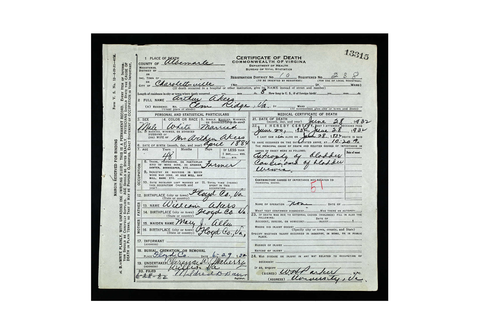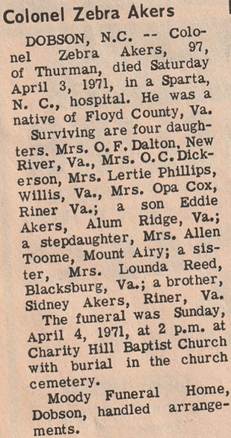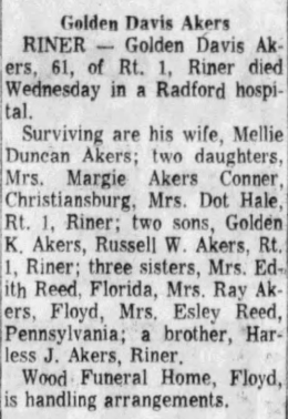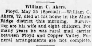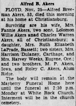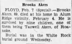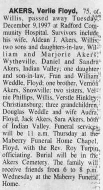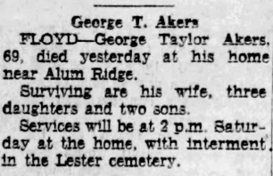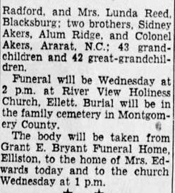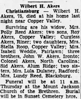 farmer, b. VA, parents b. VA, 21 yo when married, owns, HOH. Sarah E. 62 yo wife, b. VA, 24 yo when married. Freeman L. 26 yo single son, b. VA, parents b. VA, farm laborer. Graton W. 21 yo single son, b. VA, parents b. VA, laborer road construction. Teel, Maranda 70 yo widowed sister-in-law, b. VA, parents b. VA, 21 yo when 1st married. 1933 Marriage #2: A. D. Akers m. Ella Simpkins Wilson 11-8-1933 Radford, VA. He 61 yo s/o Jonathan Akers & Harriett Lester. She 38 yo d/o Truman Simpkins & Delia Ridpath. Ella, aka Gracie Alma/ Elma, d/o Truman & Cordelia (Ridpath) Simpkins. [Death Cert] 1947 Death: 8-21-1947 Belspring, Pulaski Co., VA. [Death Cert] Arteamus Dudley Akers, 75y 4m 22d, married w/m farmer, b. Mar 20, 1872 Floyd Co., VA. Spouse: Elma Simpkins. Father: Johnthan Akers, b. unknown. Mother: Harriet Lester, b. unknown. Informant: Mrs. A. D. Akers of Belspring, VA. COD: gunshot wound brain minutes rifle 22 suicide. Burial: Pulaski Co., Aug 14, 1947. 1947 News Clips: (src: Find A Grave) Farmer Near Belspring