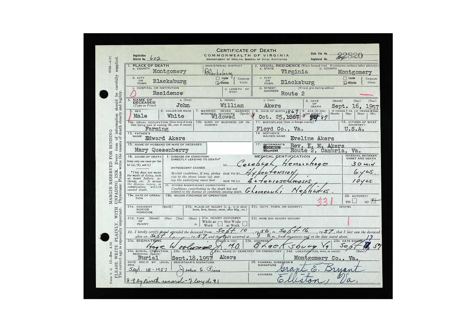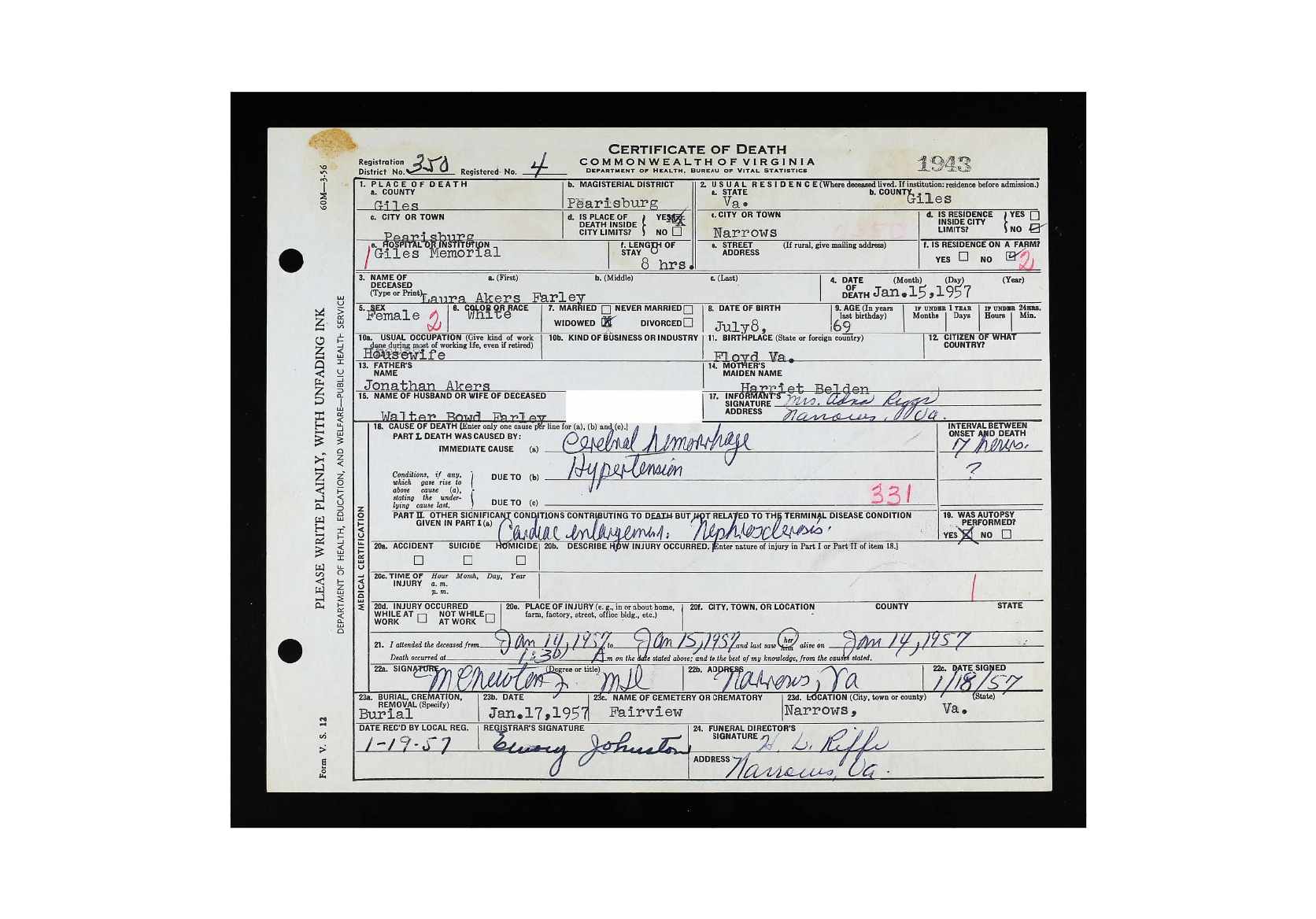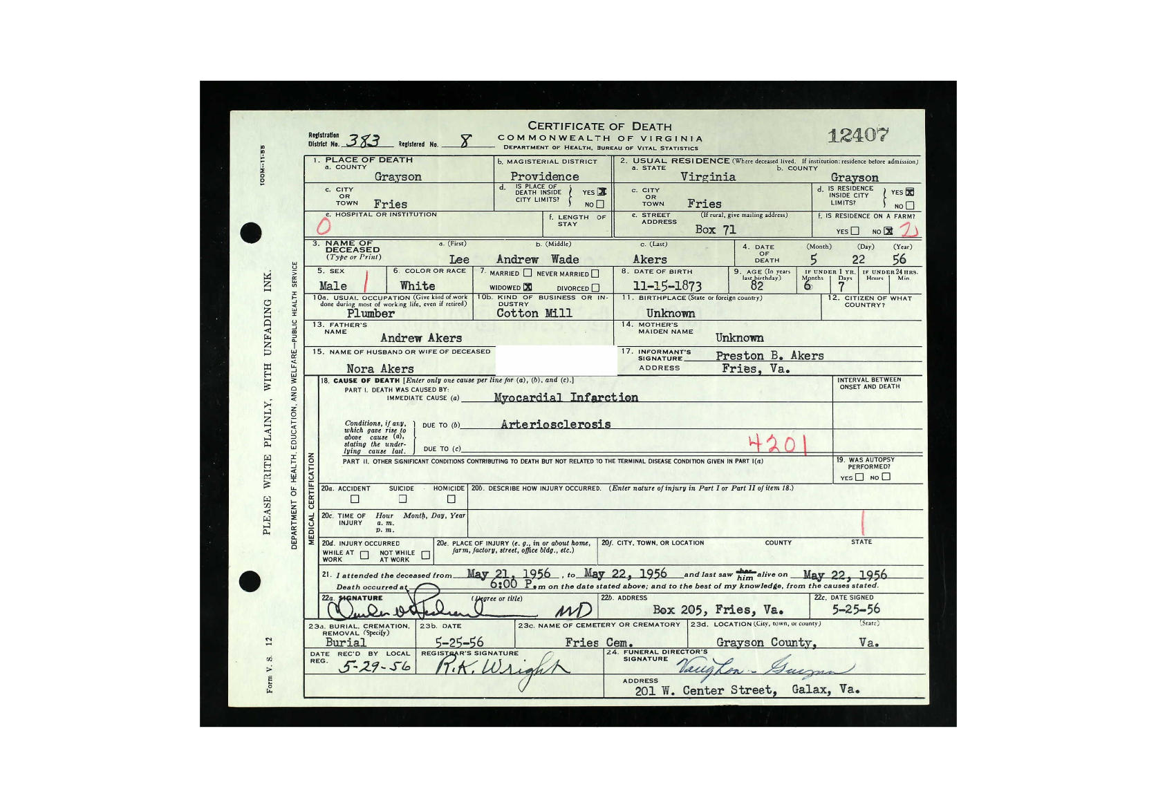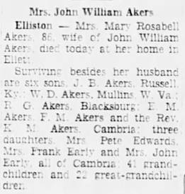 living. (does read Mary A.) Stella V. 9 yo daughter, b. Apr 1891 VA, parents b. VA, school. Maude V. 6 yo daughter, b. Feb 1894 VA, parents b. VA. James F. 2 yo son, b. Oct 1897 VA, parents b. VA. 1910 Residence: Giles Co., VA, Pearisburg District 21, H197: Akers, Wallace 41 yo w/m farmer, b. VA, parents b. VA, M1 20y, rents farm, HOH. (he can read & write) Minta A. 38 yo wife, b. VA, parents b. NC, M1 20y, 6 children with 6 living. Stella V. 19 yo single daughter, b. VA, parents b. VA. Maude V. 15 yo daughter, b. VA, parents b. VA. J. Fred 11 yo son, b. VA, parents b. VA, school. Claude 8 yo son, b. VA, parents b. VA, school. Jim 3 yo son, b. VA, parents b. VA. None 3/12 son, b. VA, parents b. VA. (i.e. not named?) 1920 Residence: Giles Co., VA, Pearisburg District 31, H113: Akers, J. Wallace 52 yo married w/m farmer, b. VA, parents b. VA, cannot read or write, owns, HOH. Mintie Alice 48 yo wife, b. VA, parents b. NC. William C. 19 yo single son, b. VA, parents b. VA. James B. 13 yo son, b. VA, parents b. VA, school. Posie M. 9 yo son, b. VA, parents b. VA, school. 1930 Residence: Giles Co., VA, Pearisburg District 6, H395: Akers, Wallace 64 yo w/m farmer, b. VA, parents b. VA, 22 yo when married, cannot read or write, HOH. Arminta A. 58 yo wife, b. Oct 1971 VA, parents b. NC, 19 yo when married. James B. 23 yo single son, b. VA, parents b. VA, farm laborer. Posie M. 20 yo son, b. VA, parents b. VA, farm laborer. 1940 Residence: Giles Co., VA, Pearisburg District 36-6, H222: Akers, James 72 yo w/m farmer, b. VA, completed G1, resided in same house 1935, owns, HOH. Mintie 69 yo wife, b. VA, completed G2, resided in same house 1935, housework. Posy 19 yo single son, b. VA, completed G4, resided in same house 1935, farm laborer. 1943 Death: 12-5-1943 rural Narrows, Pearisburg District, Giles Co., VA. James Wallace Akers, 76y 1m 18d married w/m farmer, b. Oct 17, 1866 Floyd Co., VA. Veteran: blank. Spouse: Mrs. J. A. Akers. Father: Mr. O. W. Akers, b. Floyd Co., VA. Mother: Harriet Lester, b. Franklin Co., VA. Informant: Mrs. Tom Ratliff of Narrows, VA. COD: carcinoma of prostrate 2 ½ years. Other: castration July 1942. Burial: Fairview Cem., Narrows, VA, Dec 7, 1943. 1943 Burial: Fairview Cemetery, Narrows, Giles Co., VA.