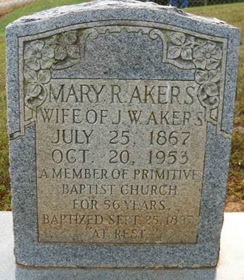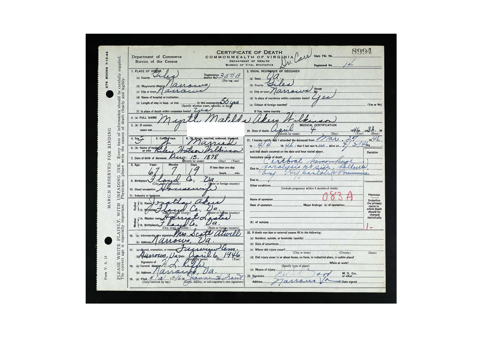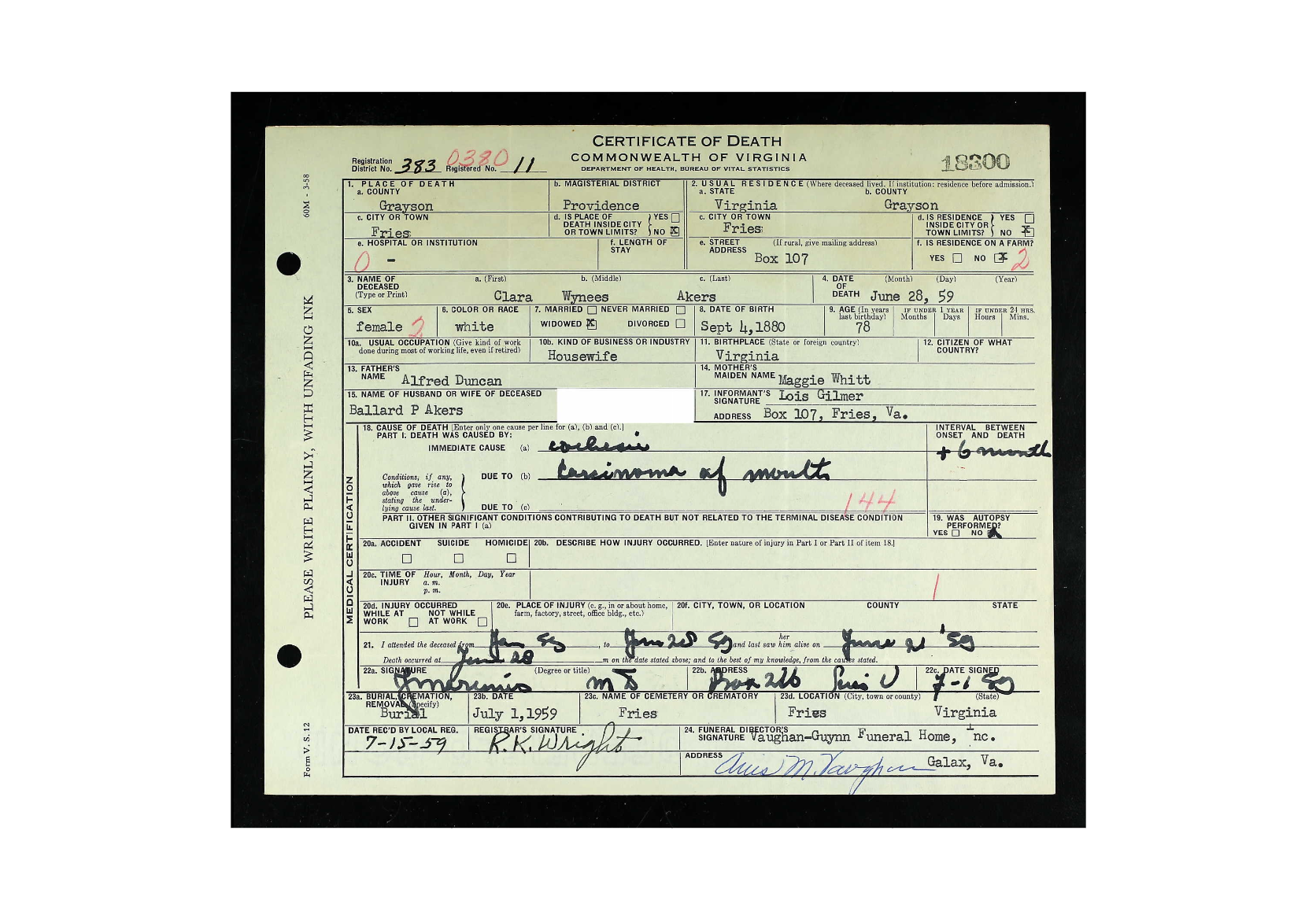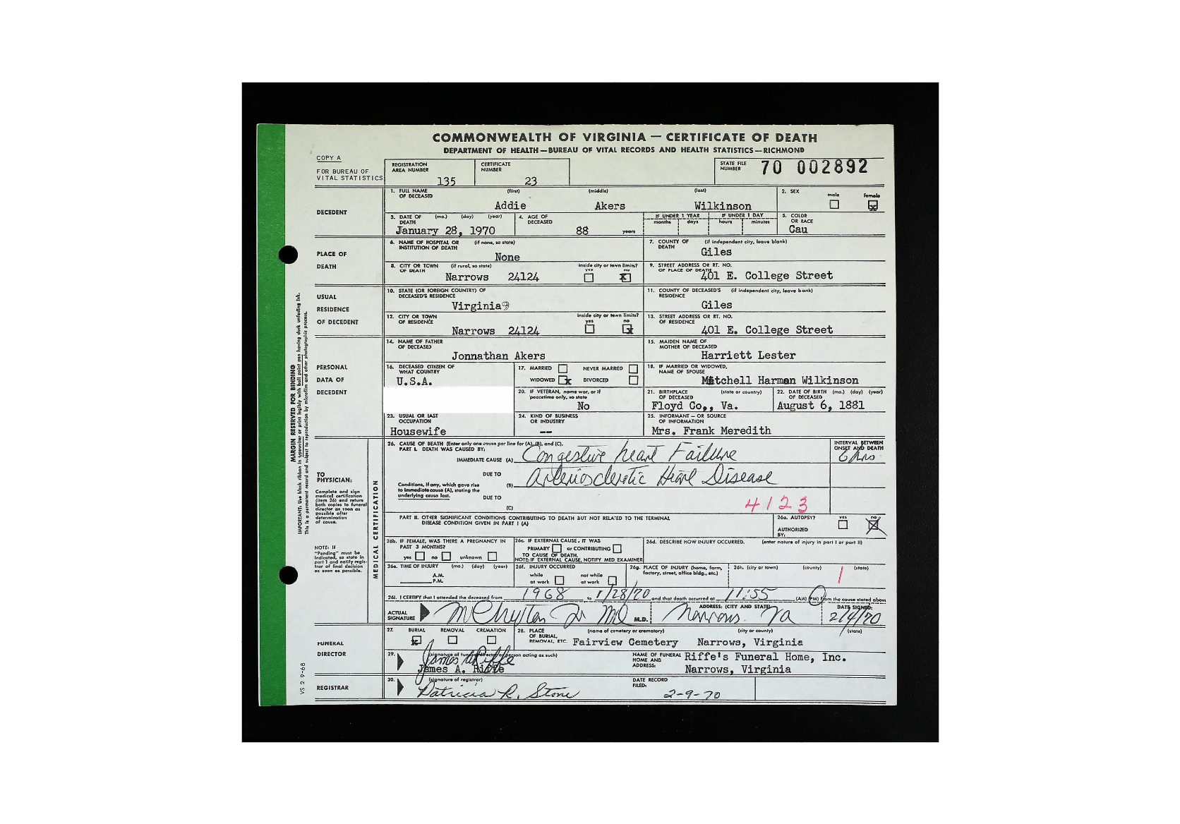 living. (does read Mary A.) Stella V. 9 yo daughter, b. Apr 1891 VA, parents b. VA, school. Maude V. 6 yo daughter, b. Feb 1894 VA, parents b. VA. James F. 2 yo son, b. Oct 1897 VA, parents b. VA. 1910 Residence: Giles Co., VA, Pearisburg District 21, H197: Akers, Wallace 41 yo w/m farmer, b. VA, parents b. VA, M1 20y, rents farm, HOH. (he can read & write) Minta A. 38 yo wife, b. VA, parents b. NC, M1 20y, 6 children with 6 living. Stella V. 19 yo single daughter, b. VA, parents b. VA. Maude V. 15 yo daughter, b. VA, parents b. VA. J. Fred 11 yo son, b. VA, parents b. VA, school. Claude 8 yo son, b. VA, parents b. VA, school. Jim 3 yo son, b. VA, parents b. VA. None 3/12 son, b. VA, parents b. VA. (i.e. not named?) 1920 Residence: Giles Co., VA, Pearisburg District 31, H113: Akers, J. Wallace 52 yo married w/m farmer, b. VA, parents b. VA, cannot read or write, owns, HOH. Mintie Alice 48 yo wife, b. VA, parents b. NC. William C. 19 yo single son, b. VA, parents b. VA. James B. 13 yo son, b. VA, parents b. VA, school. Posie M. 9 yo son, b. VA, parents b. VA, school. 1930 Residence: Giles Co., VA, Pearisburg District 6, H395: Akers, Wallace 64 yo w/m farmer, b. VA, parents b. VA, 22 yo when married, cannot read or write, HOH. Arminta A. 58 yo wife, b. Oct 1971 VA, parents b. NC, 19 yo when married. James B. 23 yo single son, b. VA, parents b. VA, farm laborer. Posie M. 20 yo son, b. VA, parents b. VA, farm laborer. 1940 Residence: Giles Co., VA, Pearisburg District 36-6, H222: Akers, James 72 yo w/m farmer, b. VA, completed G1, resided in same house 1935, owns, HOH. Mintie 69 yo wife, b. VA, completed G2, resided in same house 1935, housework. Posy 19 yo single son, b. VA, completed G4, resided in same house 1935, farm laborer. 1943 Death: 12-5-1943 rural Narrows, Pearisburg District, Giles Co., VA. James Wallace Akers, 76y 1m 18d married w/m farmer, b. Oct 17, 1866 Floyd Co., VA. Veteran: blank. Spouse: Mrs. J. A. Akers. Father: Mr. O. W. Akers, b. Floyd Co., VA. Mother: Harriet Lester, b. Franklin Co., VA. Informant: Mrs. Tom Ratliff of Narrows, VA. COD: carcinoma of prostrate 2 ½ years. Other: castration July 1942. Burial: Fairview Cem., Narrows, VA, Dec 7, 1943. 1943 Burial: Fairview Cemetery, Narrows, Giles Co., VA.