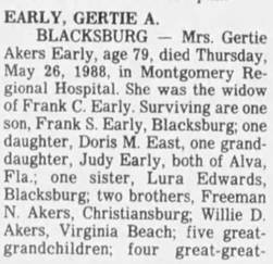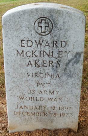 Parents: William Charlton & Mary Jane (Alley) Akers. 1897 Birth: 5-30-1897 Floyd Co., VA. 1900 Residence: Floyd Co., VA with parents. 1910 Residence: Montgomery Co., VA, Christiansburg District 100, along road & section from McAdams Road & Vicars Switch on the N. & W. R. R., H240: