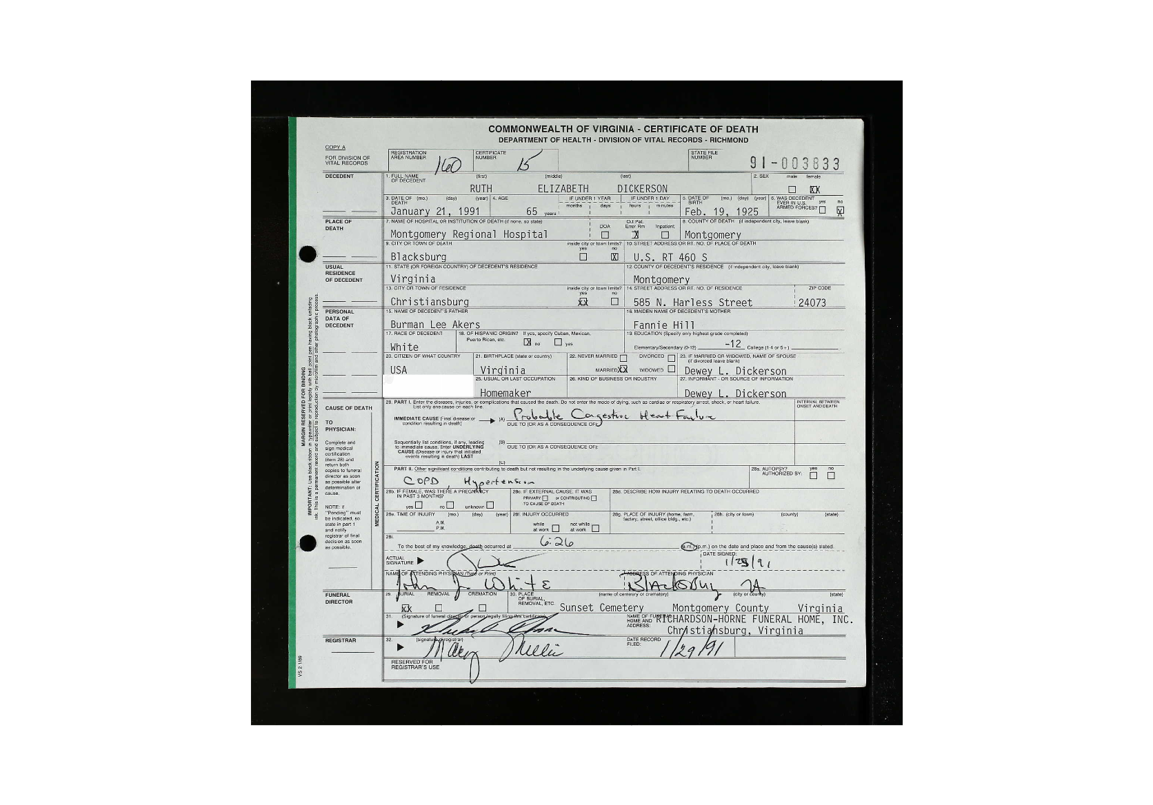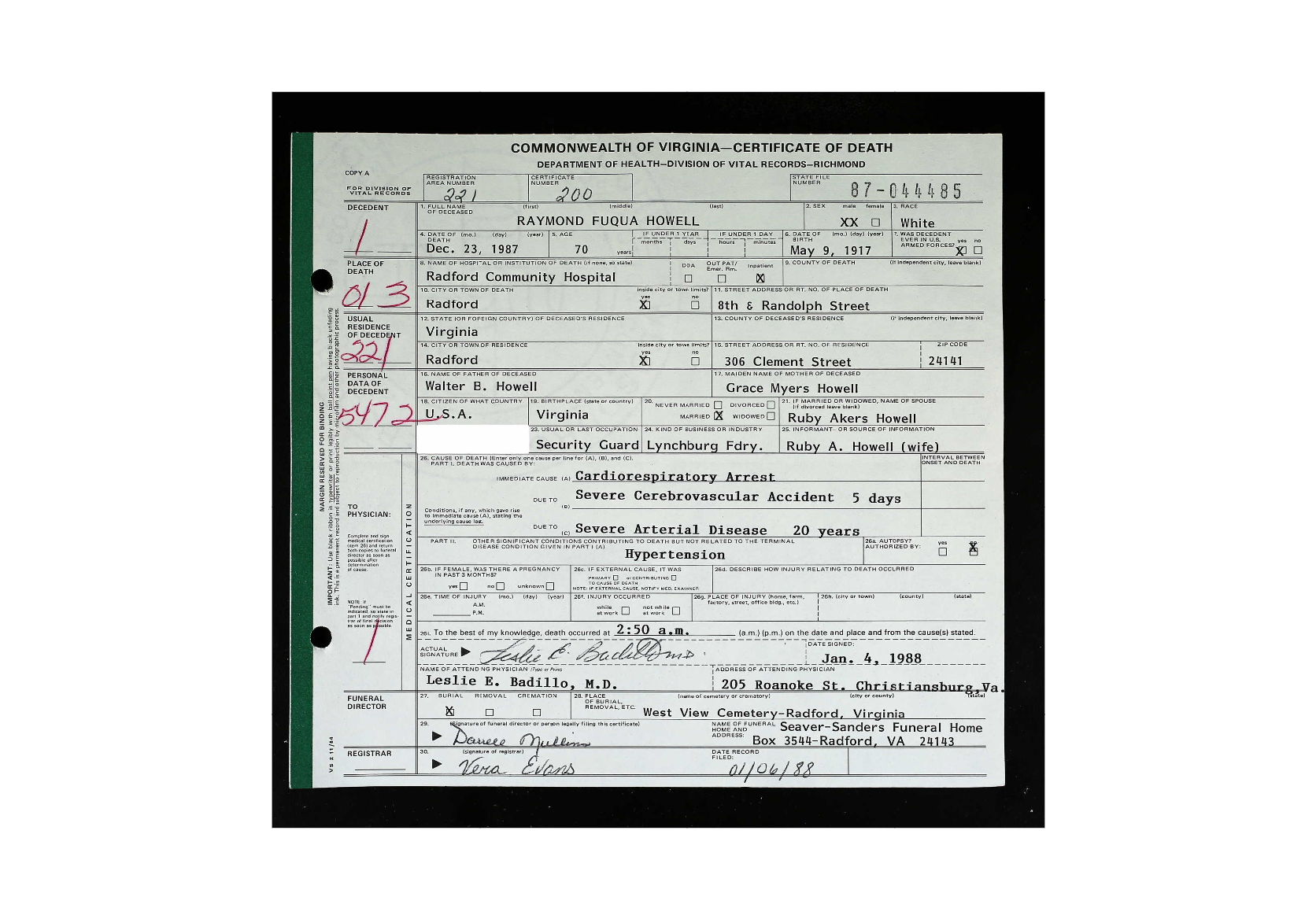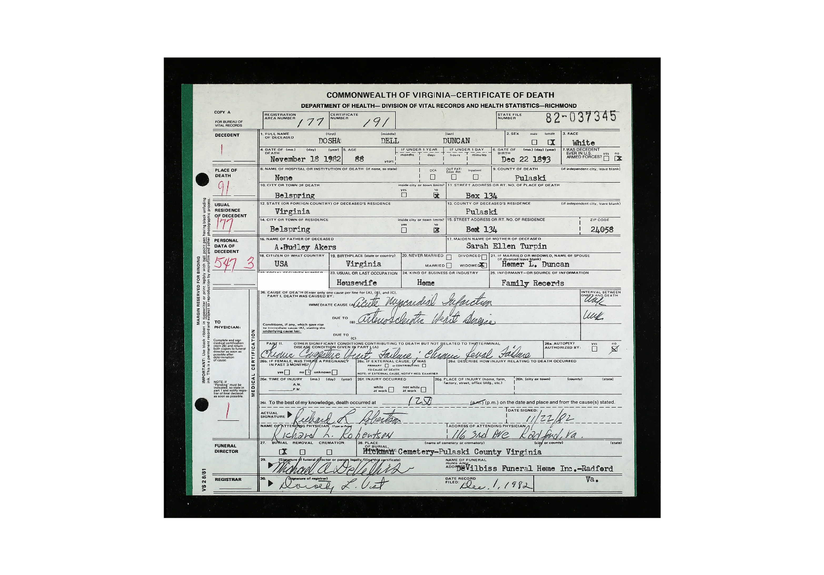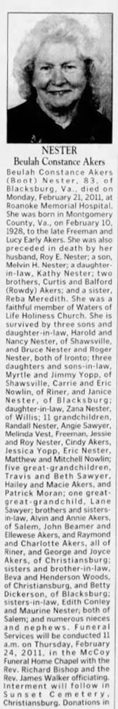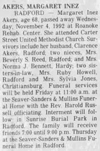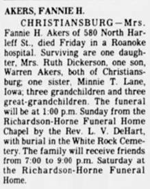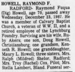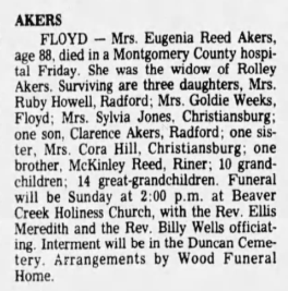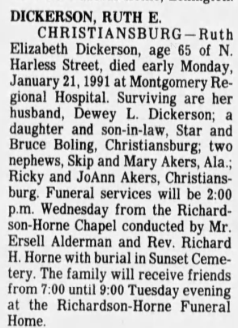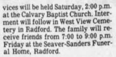 The Roanoke Times, Roanoke, Virginia · Friday, November 19, 1982 1982 Burial: Hickman Cemetery, Radford City, VA.