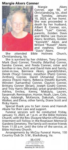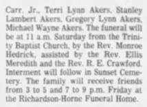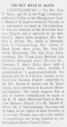 sister, Lovell Akers, Riner. Funeral services will be 2 p.m. Wednesday at the