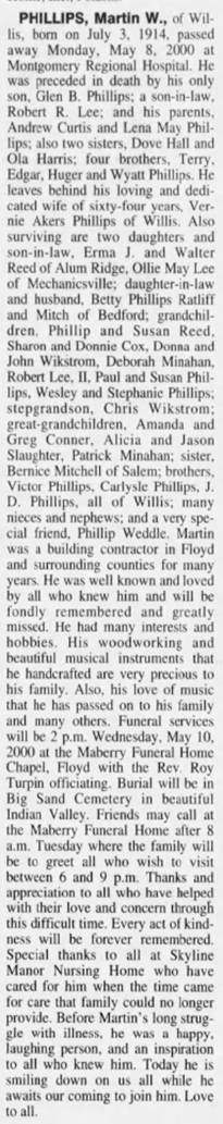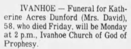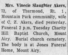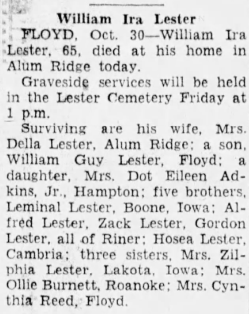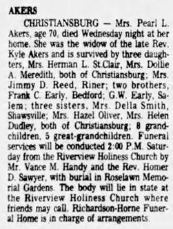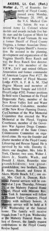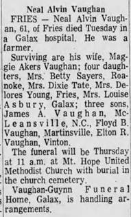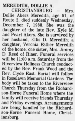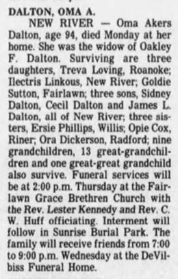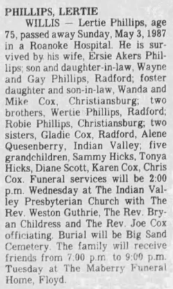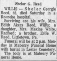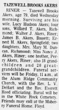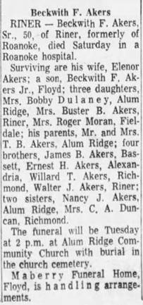 Roanoke Times and World-News, Roanoke, Virginia · Friday, October 23, 1987 1987 Burial: White Rock Cemetery, Alum Ridge, Floyd