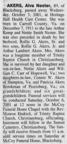 Richmond Times-Dispatch, Richmond, Virginia · Saturday, January 20, 2001 2001 Burial: Greenwood Memorial Gardens, Goochland