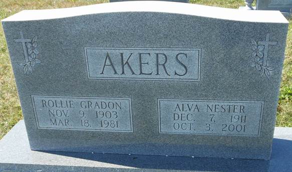 Parents: William Charlton & Mary Jane (Alley) Akers. 1899 Birth: 11-18-1899 VA. 1900, 1910 Residence: Floyd Co., VA with parents. 1918 Death: 9-5-1918 Indian Valley District, Floyd Co., VA. [Death Cert] 1918 Burial: Alley Cemetery, 413 Dulaney Rd NW, Floyd Co., VA. (no photo as of Mar 2026) |