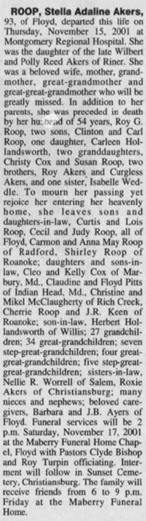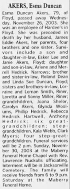 Parents: William Austin & Martha Sabrina (Wade) Duncan. [Duncan_BlanchJr_2wives] 1898 Birth: 7-21-1898 VA. 1930 Residence: Radford City, VA with husband Woodie Isaac Akers. 1940 Residence: Floyd Co., VA with husband Woodie Isaac Akers. 1996 Death: 1-28-1996 of Willis, Floyd Co., VA. AKERS, Toye Duncan, 97, of