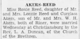 Parents: Humphrey R. & 1st wife Lucy A. (Mannon) Reed. [Reed_HumphreyE_Nancy] 1887 Birth: 3-3-1883 Floyd Co., VA. 1930, 1940 Residence: Hancock Co., IL with husband Fuller Roscoe Akers. |