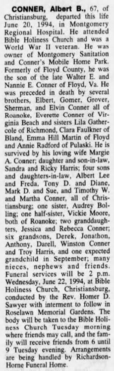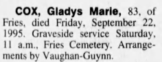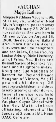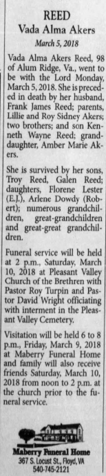 p.m. Tuesday at the Maberry Funeral Home. Roanoke Times, The (VA) - Tuesday, January 30, 1996 1996 Burial: Alley Cemetery, SR 814, Alum Ridge, Floyd Co., VA. (no photo as of Mar 2026) |