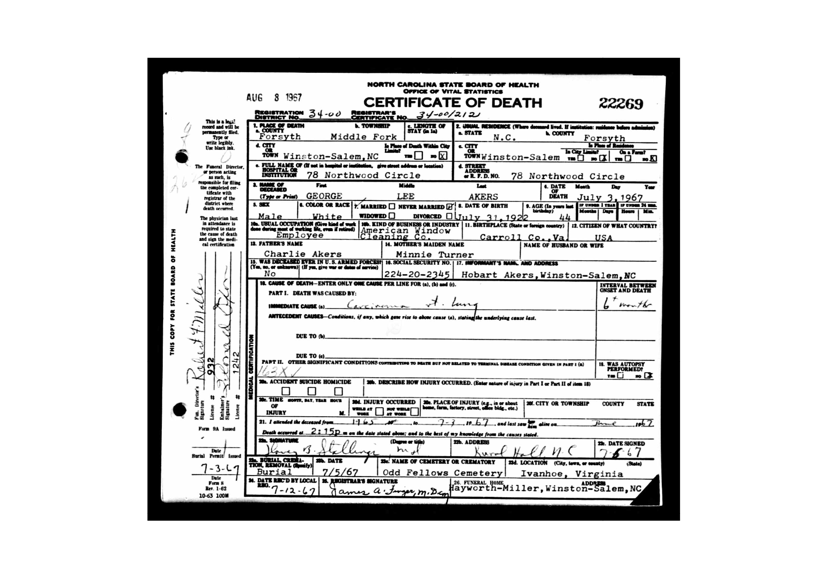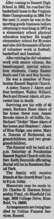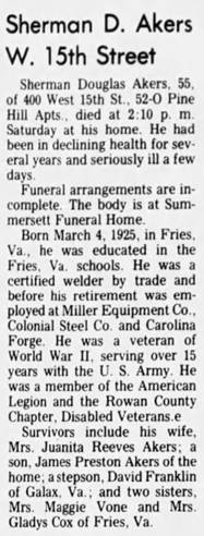 Parents: Mason McKinley Pop & Delia Sarah Rachel (Reed) Akers. 1922 Birth: 12-6-1922 Belsprings, VA. 1930 Residence: McClean Co., IL with parents. 1940 Residence: Henrico Co., VA with parents. 1947 Marriage #1: Joyce Marie Humphrey 1947 Richmond, VA. Joyce Marie Humphrey, b. Richmond, d/o Samuel G. Cleveland & 2nd wife Thelma Garnett (Saunders) Humphrey. 1982 Death: 8-11-1982 Richmond, VA. [Death Cert]