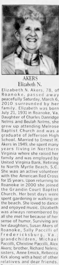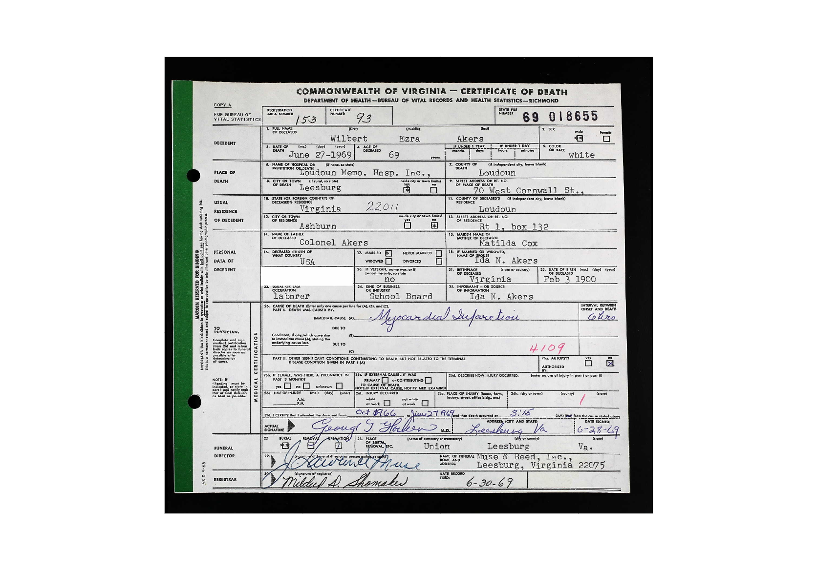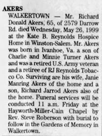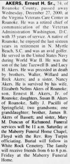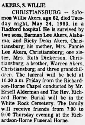 Parents: Mason McKinley Pop & Delia Sarah Rachel (Reed) Akers. 1925 Birth: 5-16-1925 VA. 1930 Residence: McClean Co., IL with parents. 1940 Residence: Henrico Co., VA with parents. Marriage #1: Doris Mae Wilson nee Huckabee, d/o Clyde & Lottie (Timberlake) Huckabee. She was 1st m. & div. from Johnnie L. Wilson. 2016 Death: 2-8-2016 of Henrico, VA.